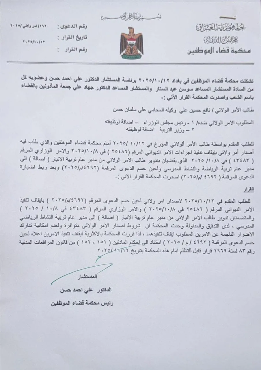أصدرت محكمة قضاء الموظفين، يوم الاثنين، قراراً بإلغاء تكليف أيمن عباس أسود كمدير لتربية محافظة الأنبار، وأعادت نافع حسين إلى منصبه السابق في إدارة المديرية.