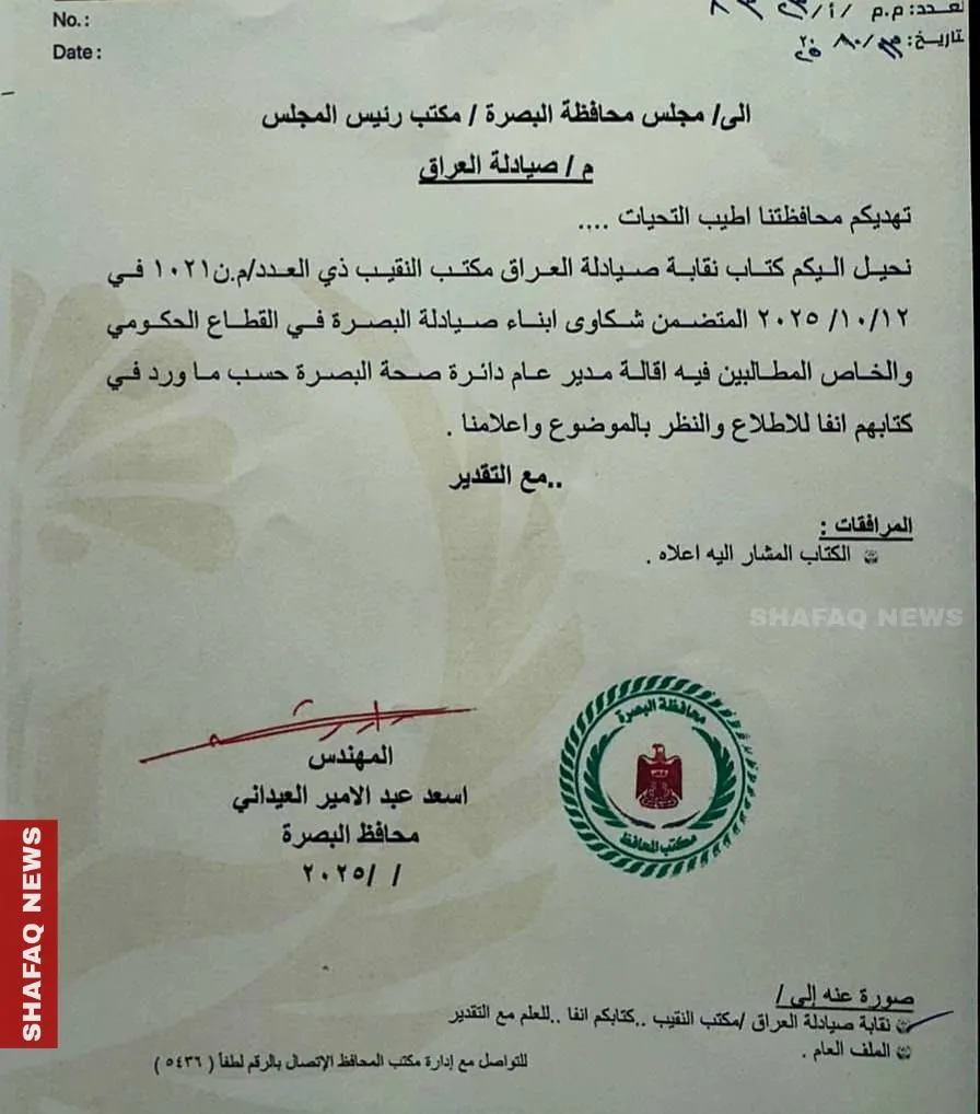 وجاء في الوثيقة التي حصلت عليها وكالة شفق نيوز، والصادرة من مكتب العيداني إلى مجلس البصرة، "نُحيل إليكم كتاب نقابة صيادلة العراق مكتب النقيب ذي العدد (م.ن/121) في 12/1/2025 المتضمن شكاوى أبناء صيدلة البصرة في القطاع الحكومي والخاص المطالبين فيه بإقالة مدير عام دائرة صحة البصرة حسب ما ورد في كتابهم لغرض الاطلاع والنظر بالموضوع واعلامنا".