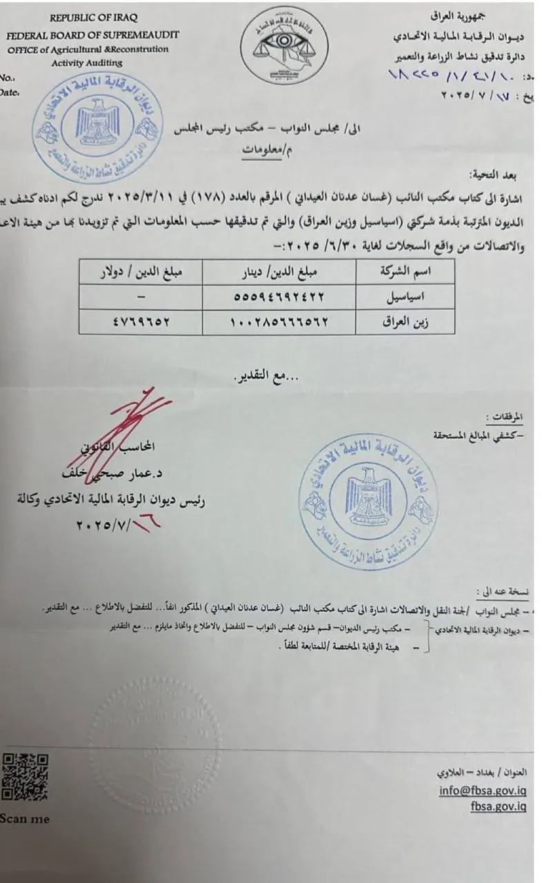 كشفت وثيقة صادرة عن ديوان الرقابة المالية، عن مجموع الديون المترتبة على شركتي الاتصالات "اسياسيل وزين العراق"، حيث تجاوزت الـ155 مليار دينار.