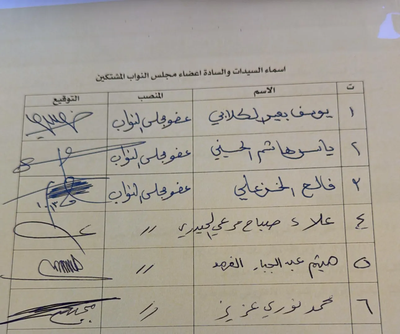 و مقدمو الشكوى ستة نواب وهم كل من: يوسف الكلابي، وياسر الحسيني، وفالح الخزعلي، وعلاء الحيدري، وهيثم الفهد، ومحمد نوري.