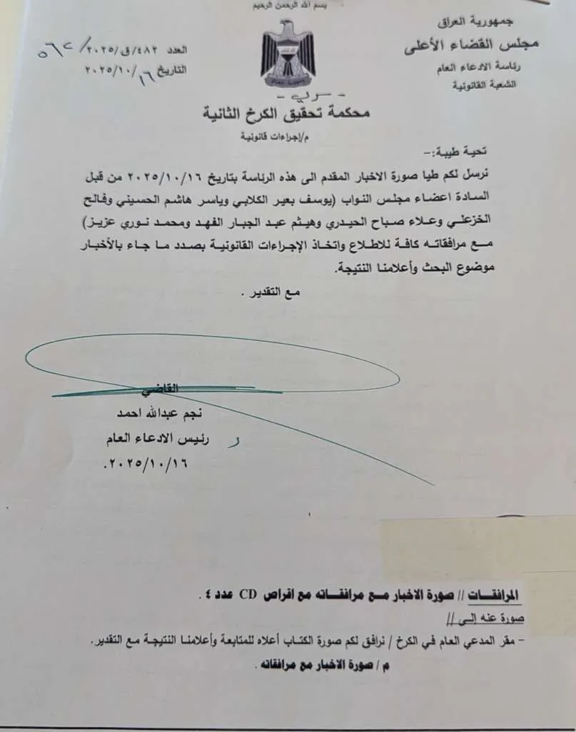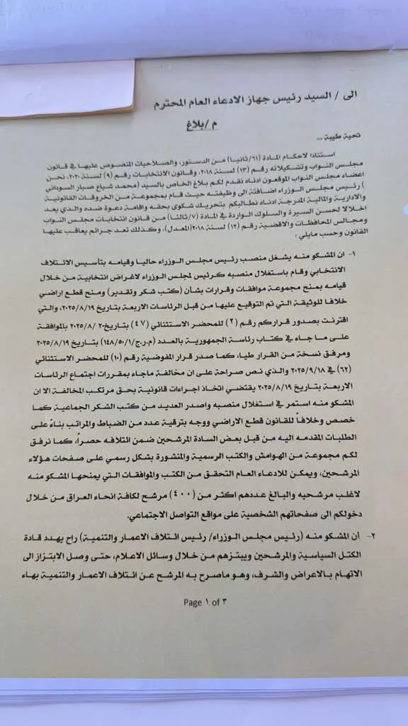 أحالت رئاسة الادعاء في العراق، شكوى لأعضاء في مجلس النواب ضد رئيس مجلس الوزراء محمد شياع السوداني إلى المحكمة المختصة بالتحقيق في قضايا النزاهة عن عدد من المخالفات القانونية.