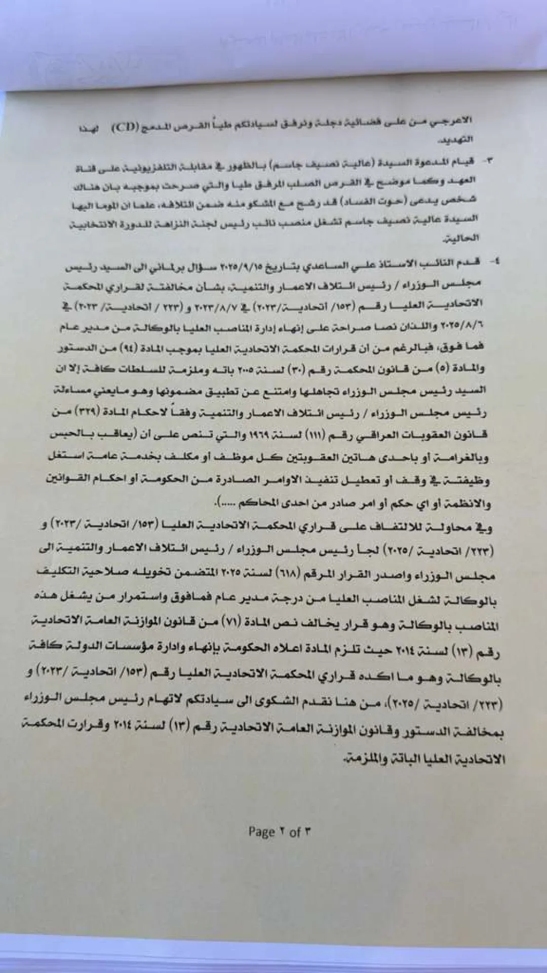 كما وطالبوا بالتحقيق في مخالفة السوداني لقرار المحكمة الاتحادية العليا (أعلى سلطة قضائية) الذي يقضي بإنهاء ادارة المناصب العليا بالوكالة.