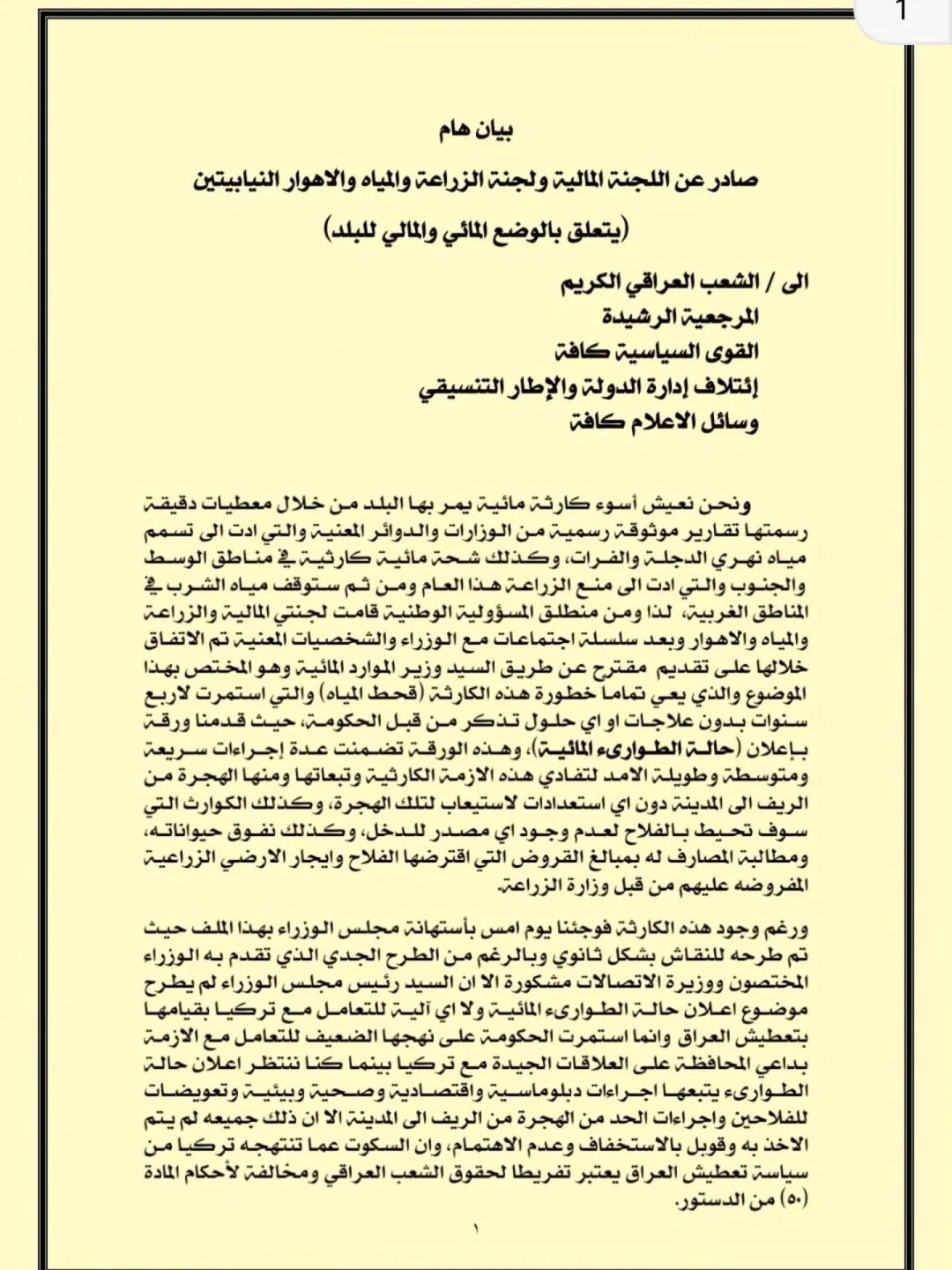 أصدرت لجنتا المالية، والزراعة والمياه والأهوار، النيابيتان، مساء اليوم الأربعاء، بياناً مشتركاً بشأن الوضع المائي والمالي للبلاد.