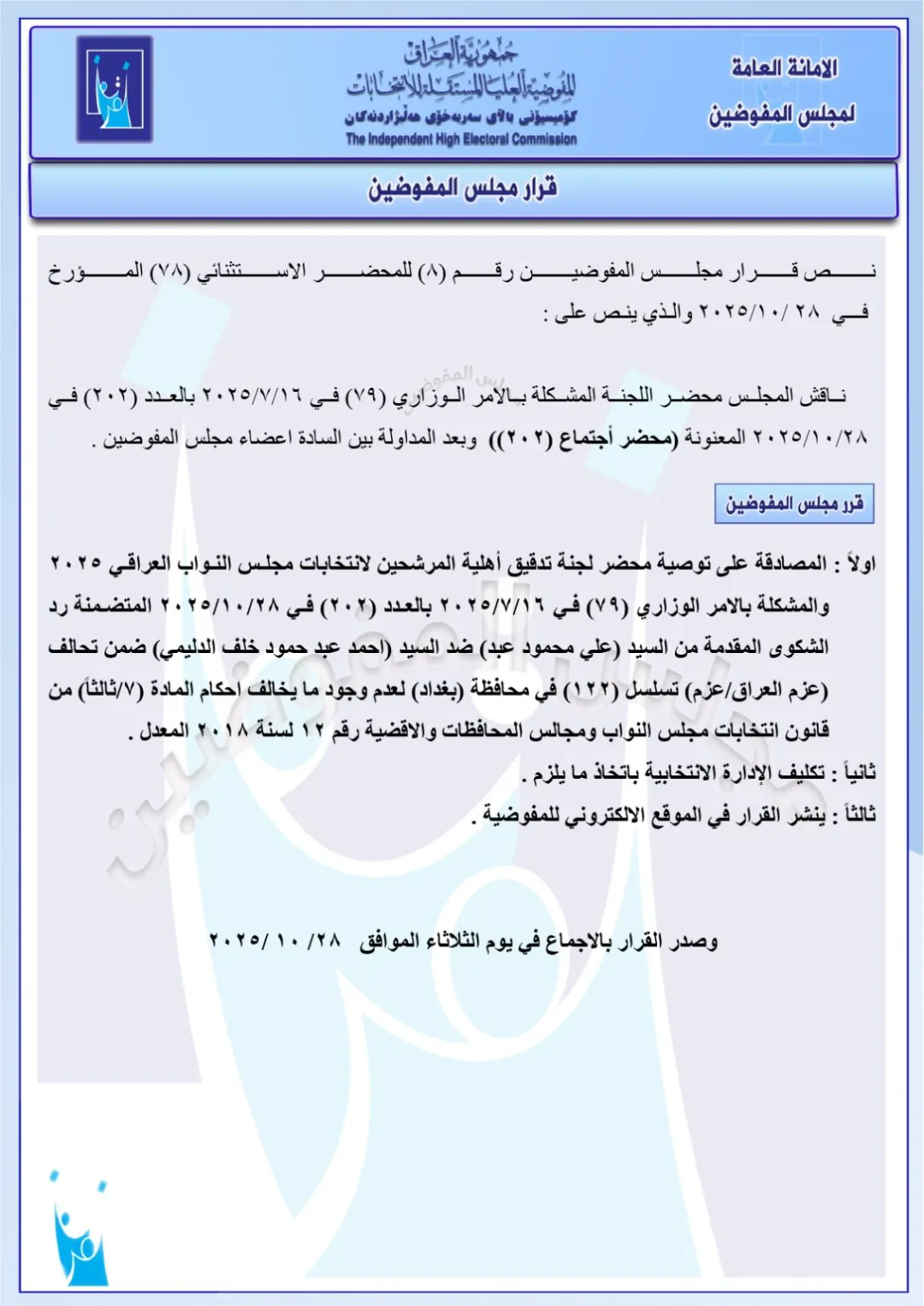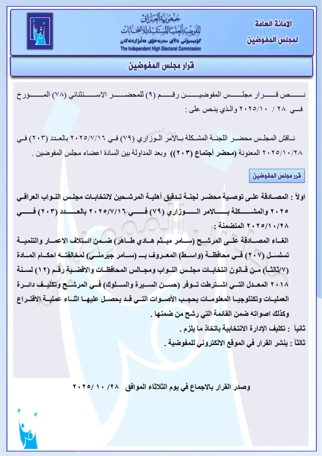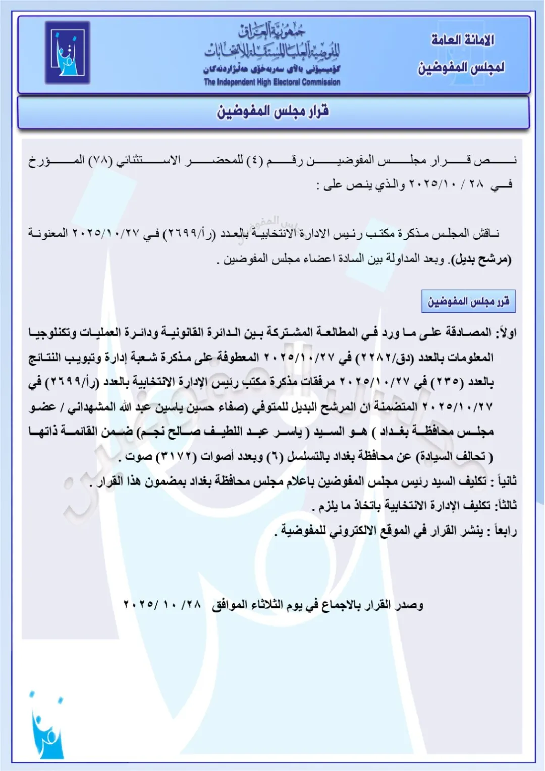 كما قرر مجلس المفوضين، المصادقة على ما ورد في المطالعة المشتركة بين الدائرة القانونية ودائرة العمليات وتكنلوجيا المعلومات المعطوفة على مذكرة شعبة إدارة وتبويب النتائج المتضمنة ان المرشح البديل للمتوفي صفاء حسين ياسين عبد الله المشهداني/ عضو مجلس محافظة بغداد، هو ياسر عبد اللطيف صالح نجم ضمن القائمة ذاتها (تحالف السيادة) عن محافظة بغداد بالتسلسل 6 وبعدد أصوات 3172، وفقاً للوثائق ذاتها .