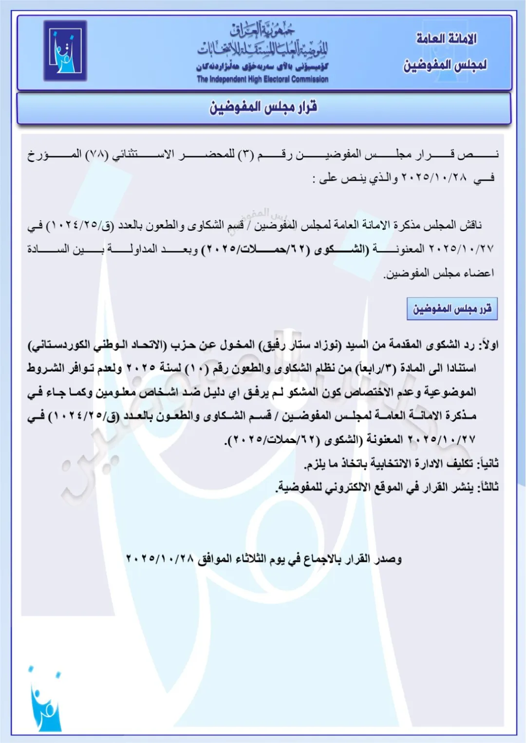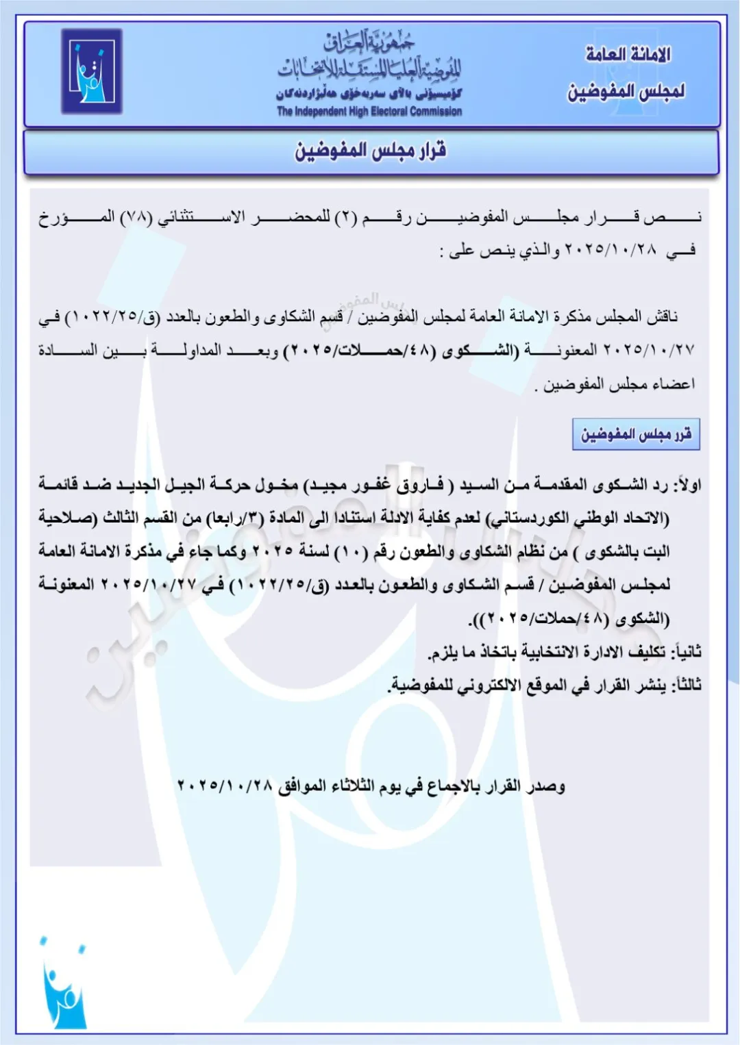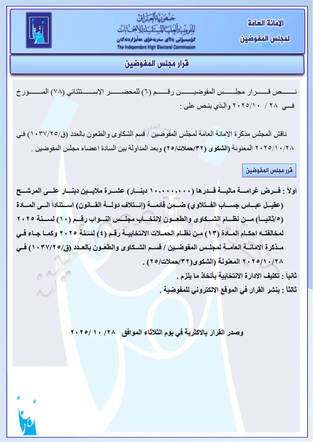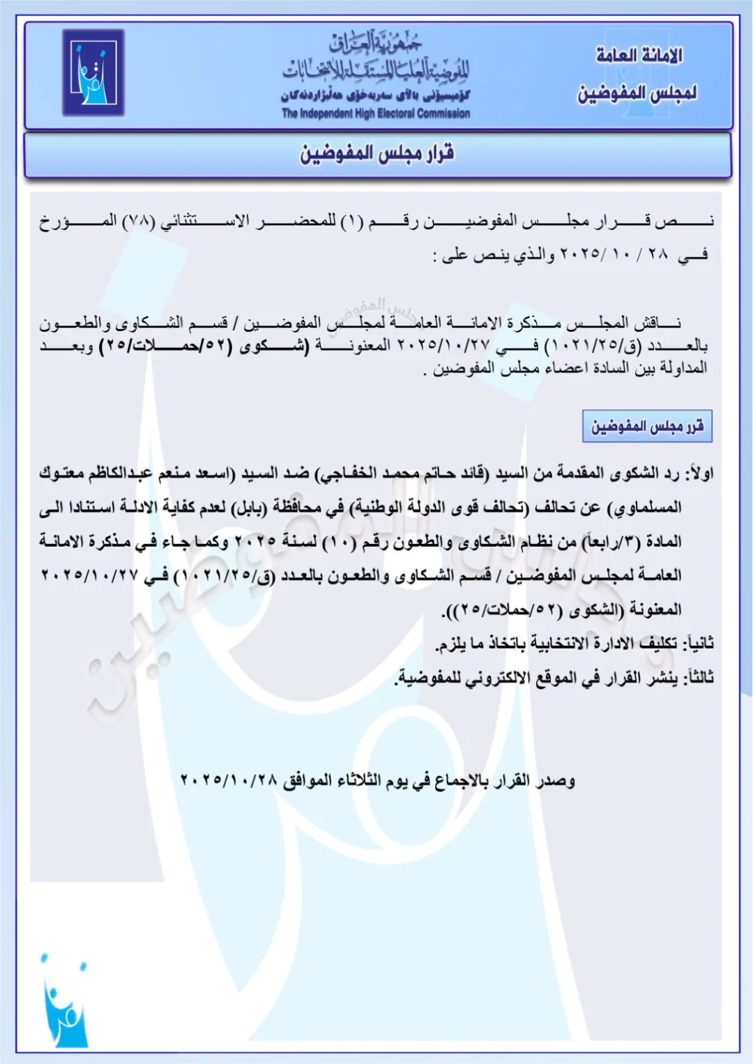 كما قرر مجلس المفوضين، المصادقة على ما ورد في المطالعة المشتركة بين الدائرة القانونية ودائرة العمليات وتكنلوجيا المعلومات المعطوفة على مذكرة شعبة إدارة وتبويب النتائج المتضمنة ان المرشح البديل للمتوفي صفاء حسين ياسين عبد الله المشهداني/ عضو مجلس محافظة بغداد، هو ياسر عبد اللطيف صالح نجم ضمن القائمة ذاتها (تحالف السيادة) عن محافظة بغداد بالتسلسل 6 وبعدد أصوات 3172، وفقاً للوثائق ذاتها .