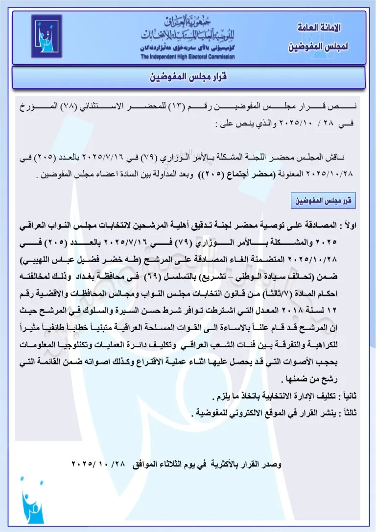 وأكد المجلس، "تكليف دائرة العمليات وتكنولوجيا المعلومات بحجب الأصوات التي قد يحصل عليها أثناء عملية الاقتراع وكذلك أصواته ضمن القائمة التي رشح من ضمنها".