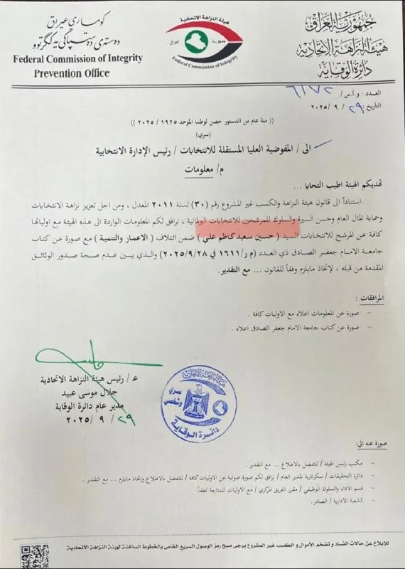 وفي وثيقة أخرى، موجّهة من هيئة النزاهة الاتحادية إلى رئيس الإدارة الانتخابية في المفوضية العليا المستقلة للانتخابات، أشارت معلومات خاصة بالمرشح حسين سعيد كاظم علي المعروف بحسين عرب، ضمن ائتلاف الإعمار والتنمية، إلى عدم صحة صدور الوثائق المقدمة من قبله وفقاً لكتاب لجامعة الإمام جعفر الصادق.