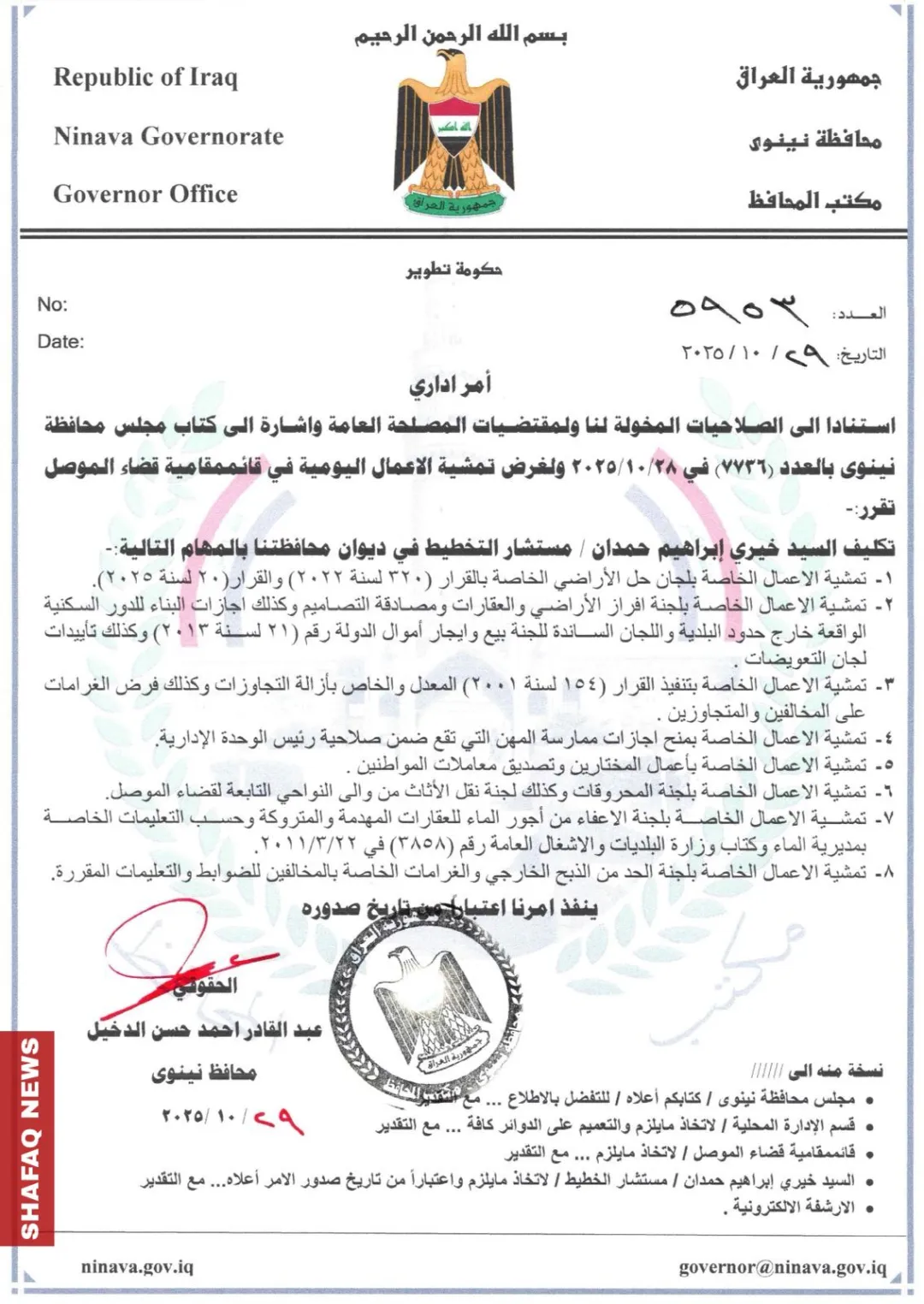 وذكر المصدر لوكالة شفق نيوز، أن "محافظ نينوى عبد القادر الدخيّل أصدر أمرًا إداريًا بتكليف خيري إبراهيم حمدان، مستشار التخطيط في ديوان المحافظة، بإدارة مهام قائممقام قضاء الموصل ومنحه الصلاحيات اللازمة لمتابعة الأعمال اليومية ومحاسبة المتجاوزين وتنظيم منح الإجازات ومتابعة عمل اللجان المختصة، لحين حسم التعيين بشكل نهائي".