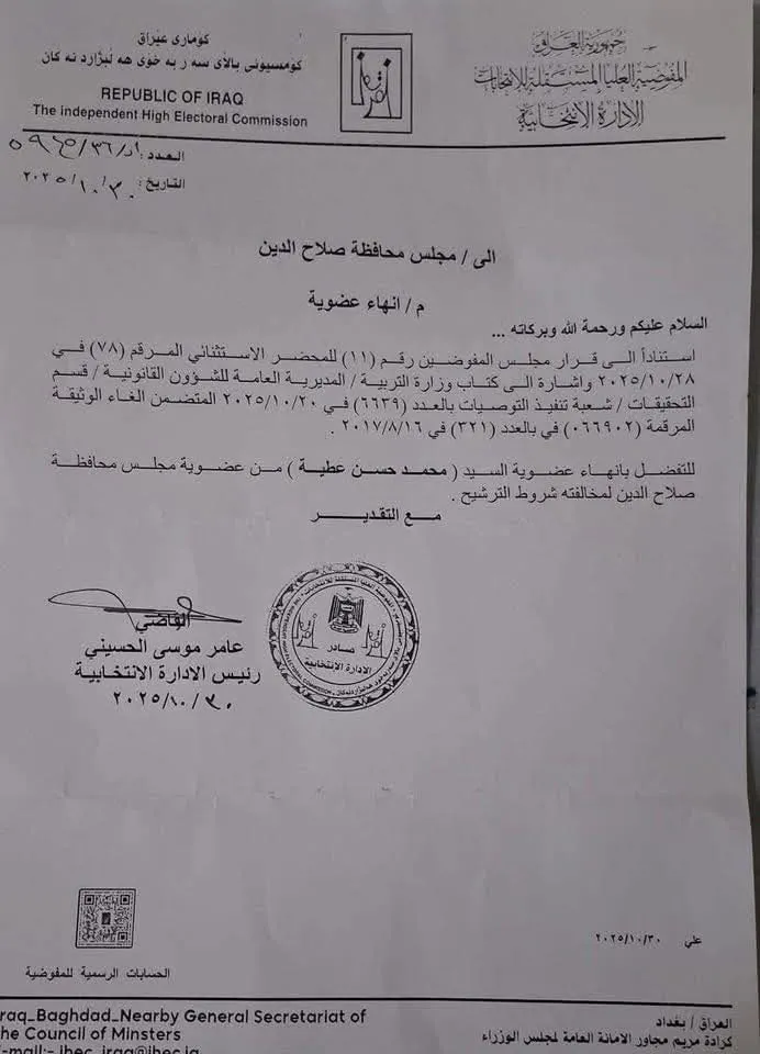 وفي السياق ذاته، وجهت المفوضية كتاباً رسمياً إلى مجلس محافظة صلاح الدين للتنفيذ الفوري للقرار وإنهاء عضوية عطية، مؤكدة أن هذا الإجراء يأتي ضمن إطار الرقابة على التزام أعضاء المجالس المحلية بشروط الترشح والقوانين النافذة.