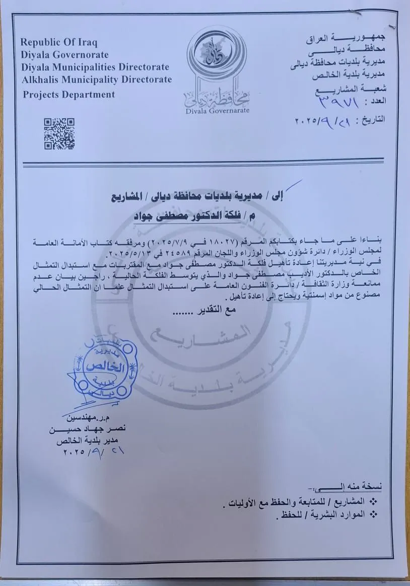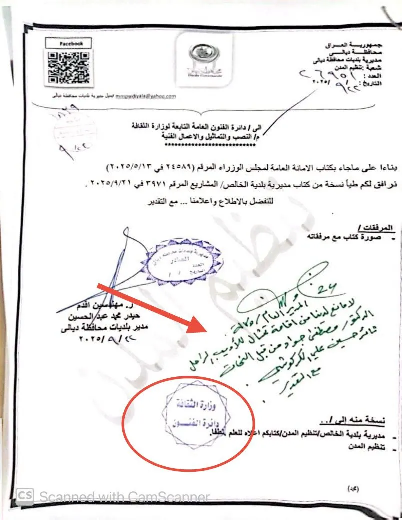 وأضاف "نؤكد للرأي العام أن هذه الادعاءات عارية عن الصحة تماماً وأن لدى محافظة ديالى كتباً رسمية ومخاطبات موثقة وموافقات صادرة من وزارة الثقافة نفسها تتضمن الموافقات الأصولية والإجراءات الإدارية الموقعة وفق السياقات القانونية المعتمدة".