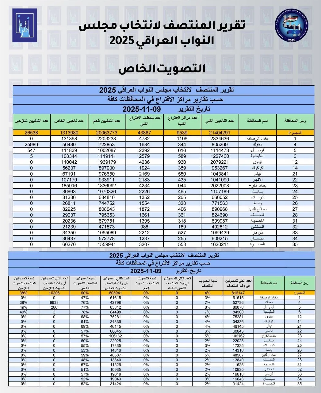 أعلنت مفوضية الانتخابات، يوم الأحد، عن نسبة المشاركة في الاقتراع الخاص، لغاية منتصف نهار اليوم.