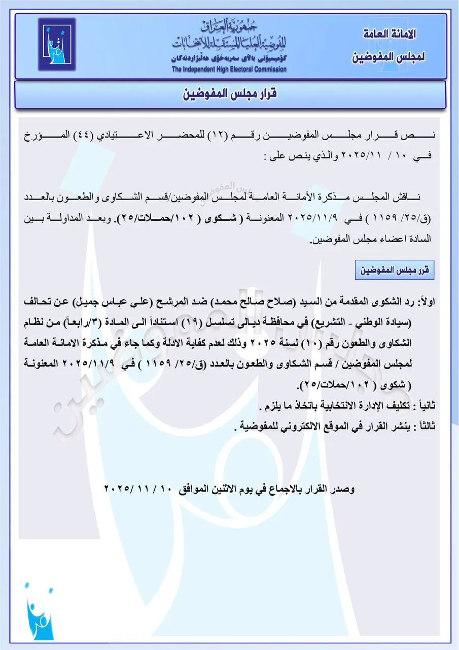 ورد الشكوى المقدمة من صلاح صالح محمد، ضد المرشح علي عباس جميل عن تحالف سيادة الوطني - التشريع في محافظة ديالى.