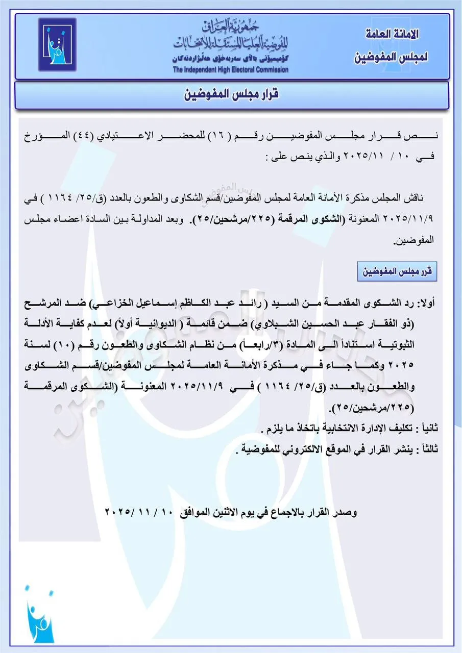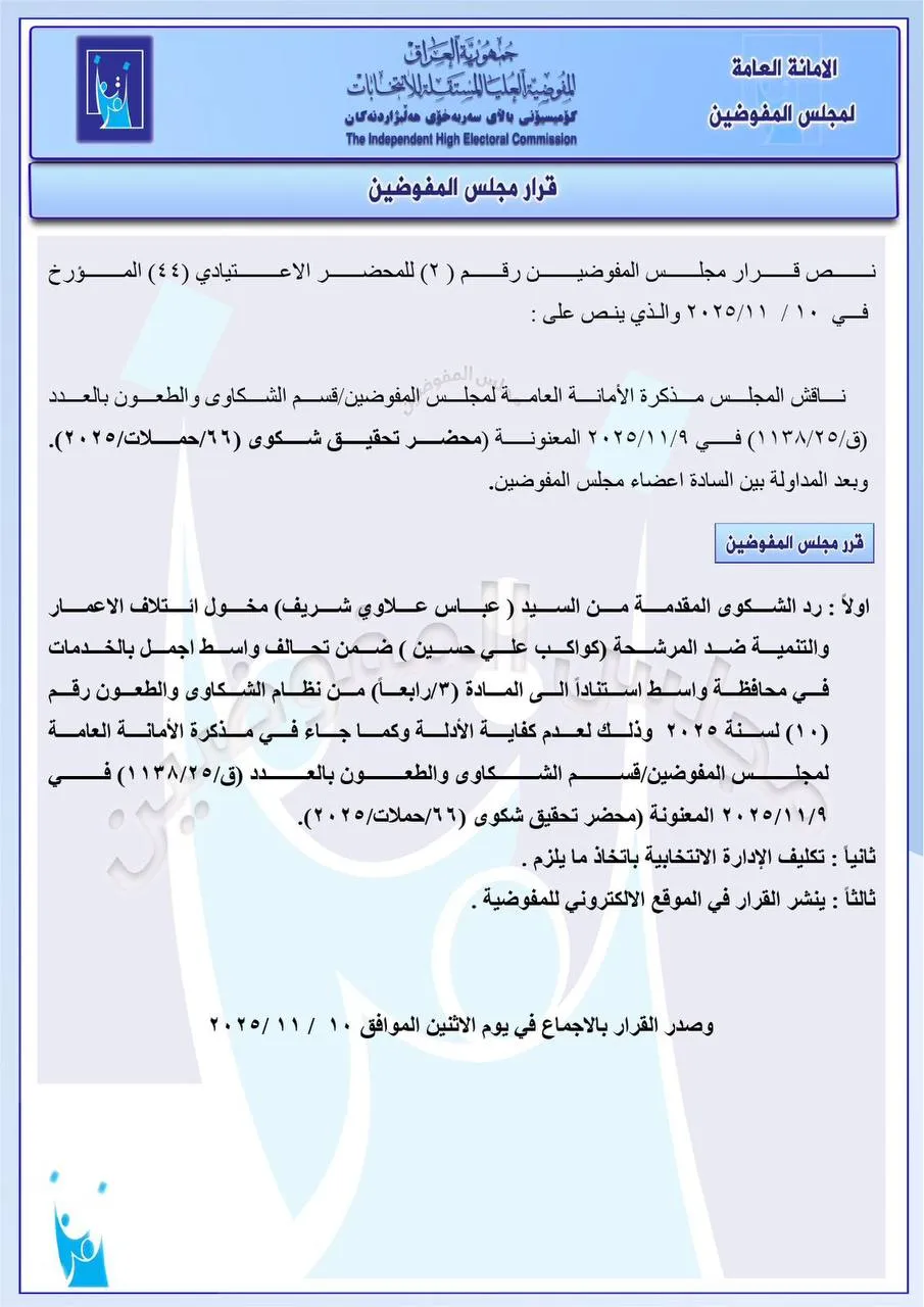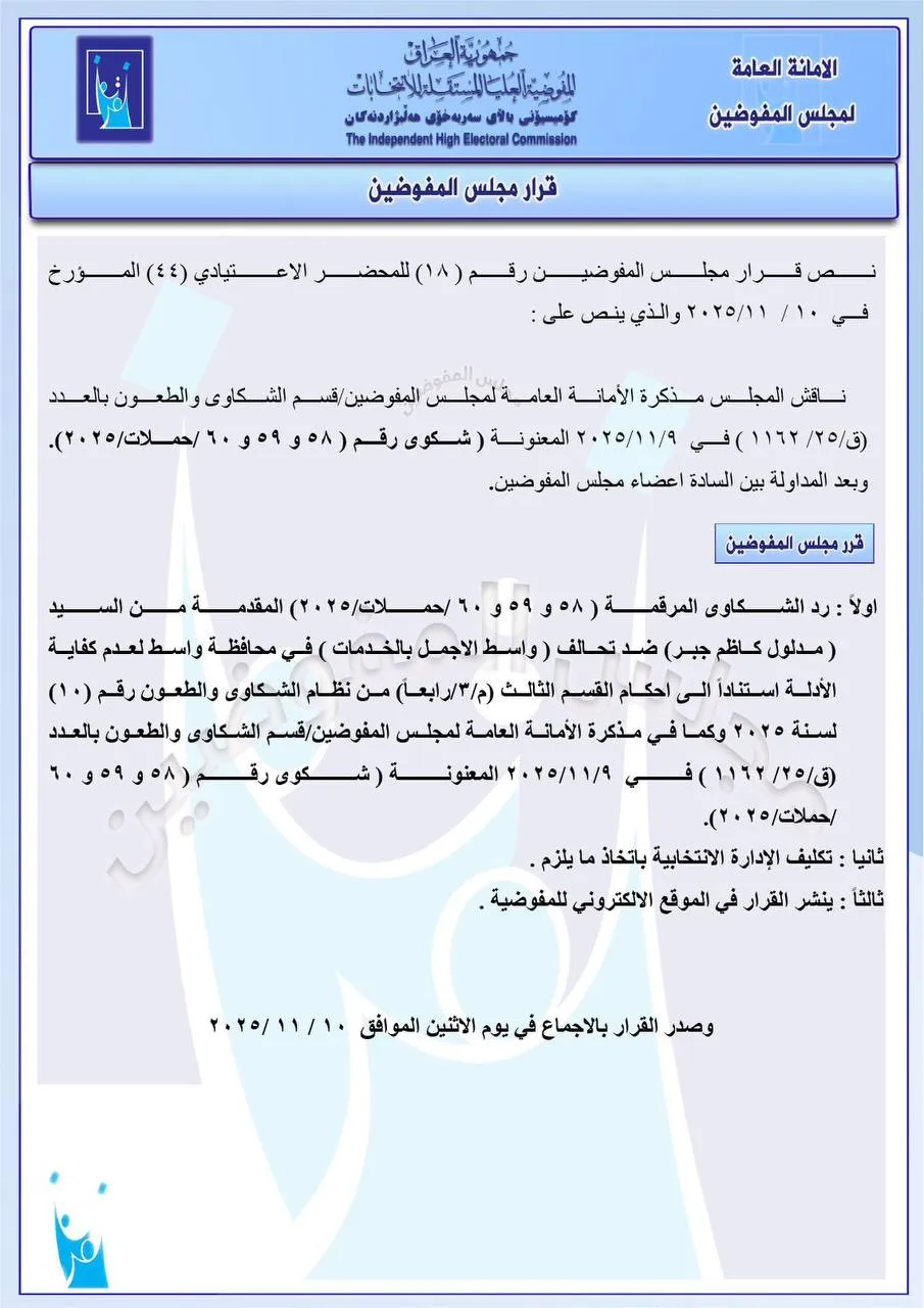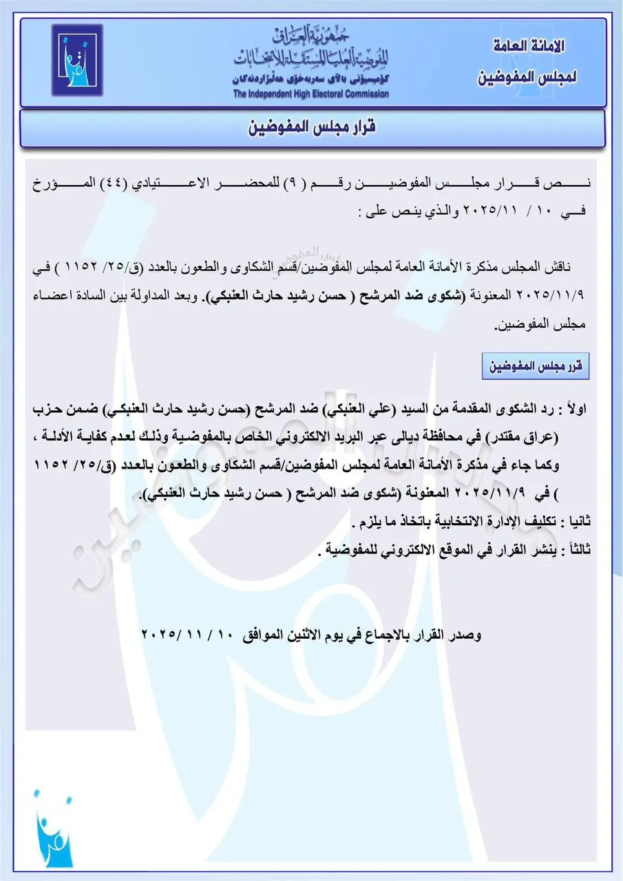 ورد الشكوى المقدمة من علي العنبكي ضد المرشح حسن رشيد حارث العنبكي ضمن حزب "عراق مقتدر" في محافظة ديالى، والشكوى المقدمة من عماد محسن حسن، ضد المرشح طلال حسين الزوبعي عن تحالف العزم في محافظة بغداد.