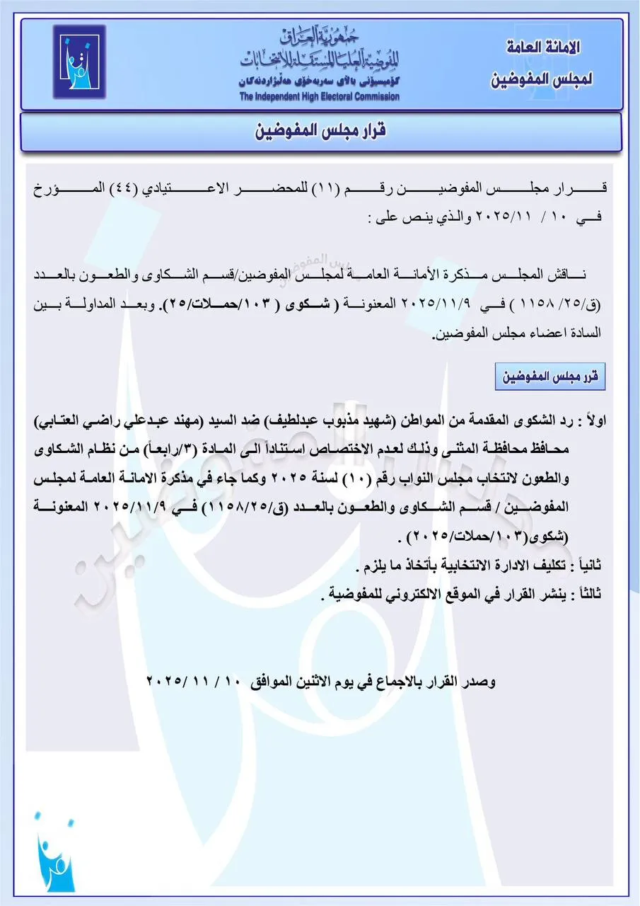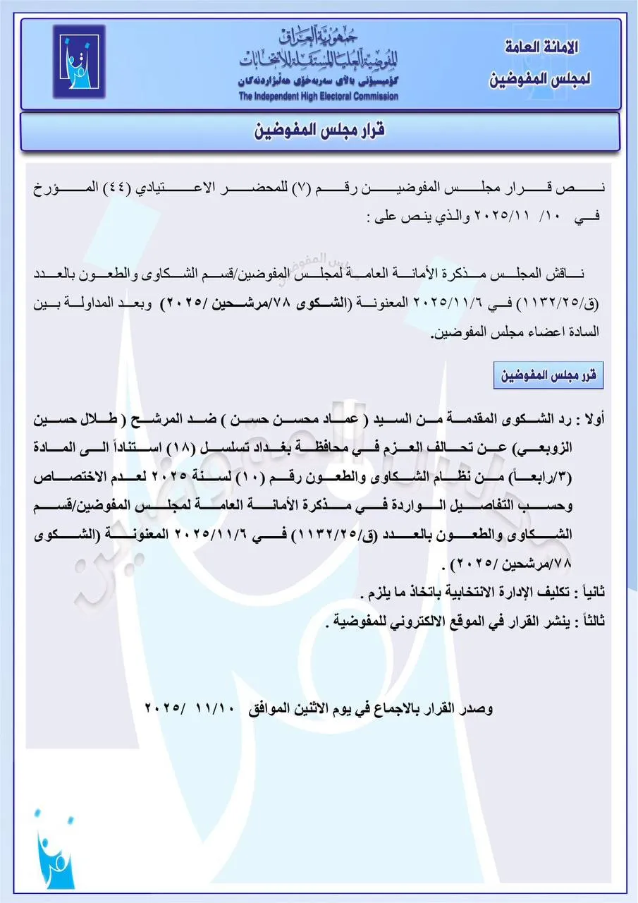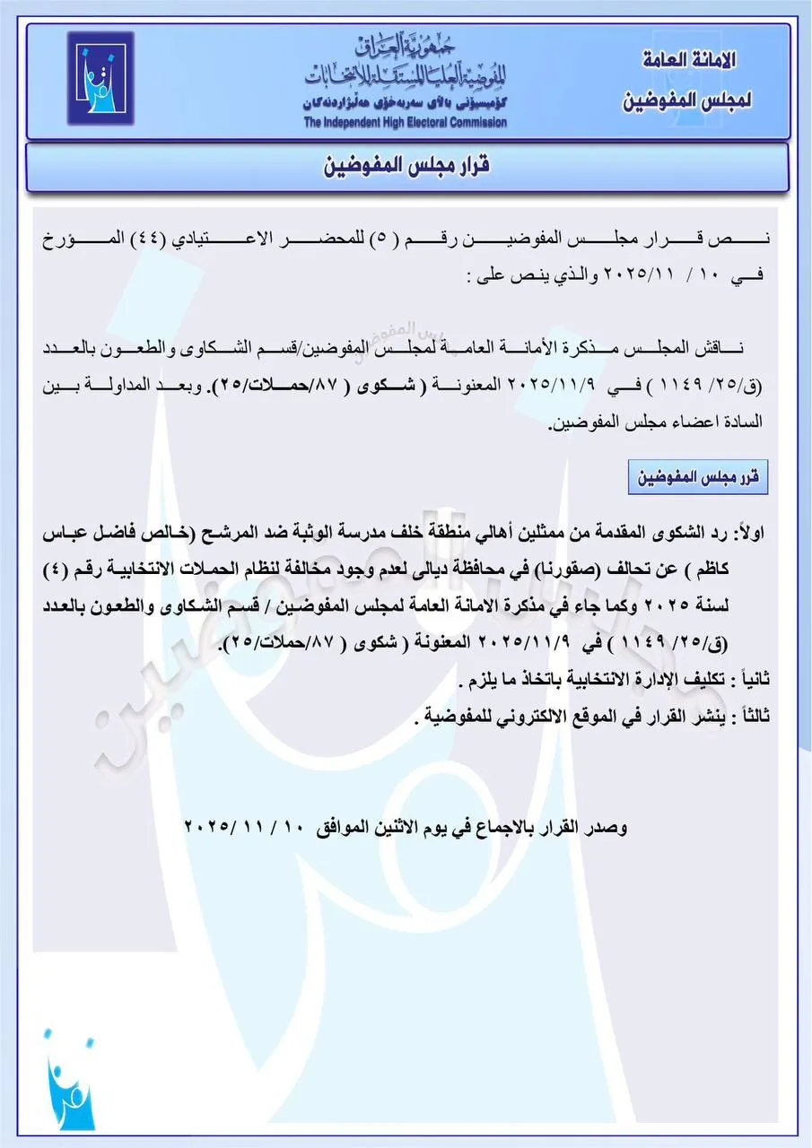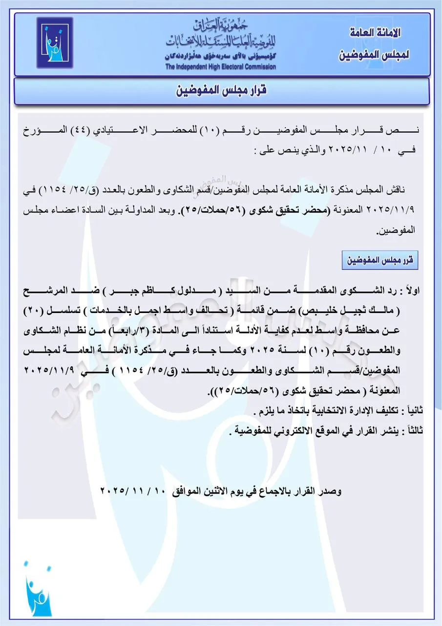 ورد الشكوى المقدمة من علي العنبكي ضد المرشح حسن رشيد حارث العنبكي ضمن حزب "عراق مقتدر" في محافظة ديالى، والشكوى المقدمة من عماد محسن حسن، ضد المرشح طلال حسين الزوبعي عن تحالف العزم في محافظة بغداد.