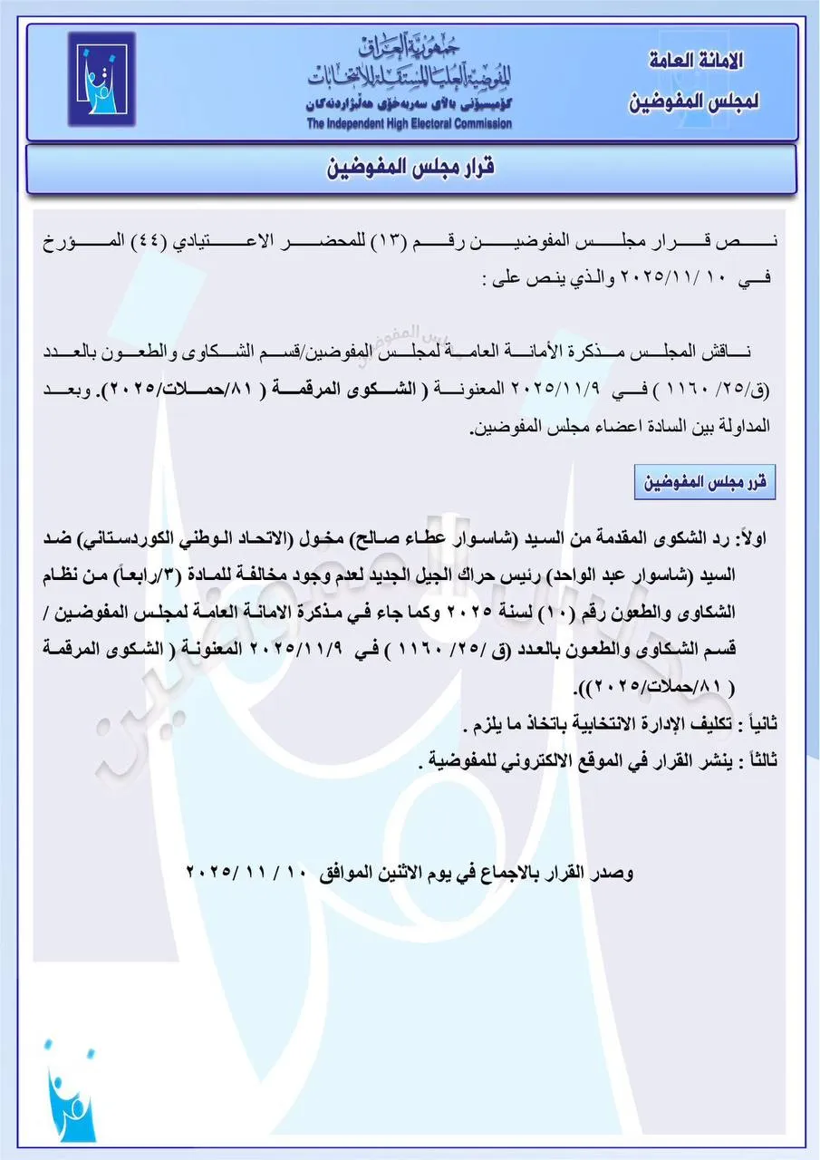 رد الشكوى المقدمة من شاسوار عطاء صالح مخول الاتحاد الوطني الكوردستاني ضد شاسوار عبد الواحد رئيس حراك الجيل الجديد لعدم وجود مخالفة.