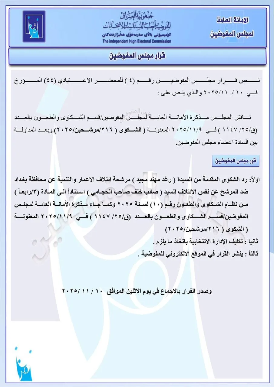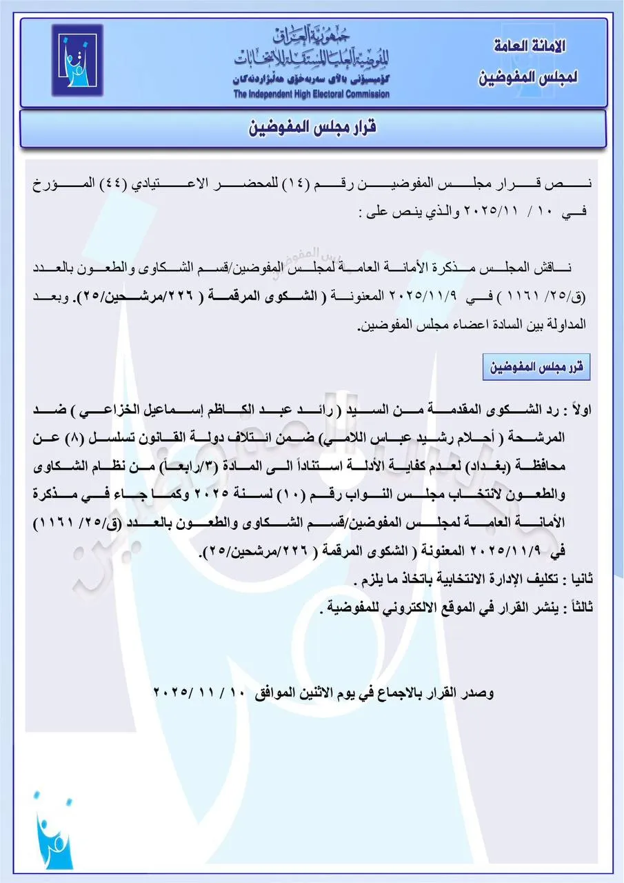 ورد الشكوى المقدمة من رائد عبد الكاظم إسماعيل الخزاعي ضد المرشحة أحلام رشيد عباس اللامي ضمن ائتلاف دولة القانون عن محافظة بغداد لعدم كفاية الأدلة.