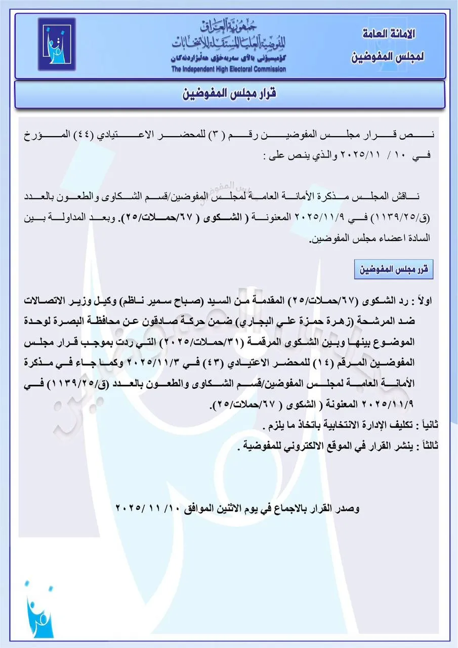 ورد الشكوى المقدمة من صباح سمير ناظم، وكيل وزير الاتصالات ضد المرشحة زهرة حمزة علي البجاري ضمن حركة صادقون عن محافظة البصرة.