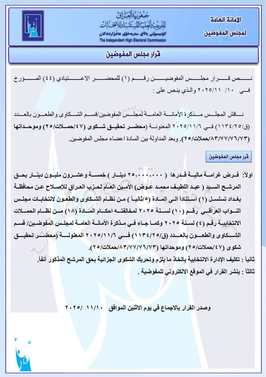 وجاء كذلك فرض غرامة مالية قدرها 25 مليون دينار بحق المرشح عبد اللطيف محمد عوض الأمين العام لحزب العراق للإصلاح عن محافظة بغداد.