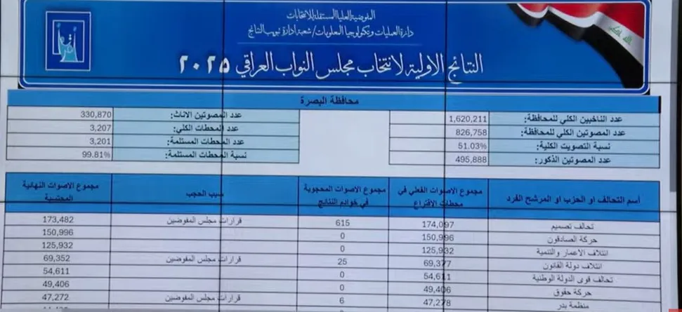 نتائج الانتخابات.. البصرة: تصميم الأول وصادقون ثانياً والإعمار والتنمية ثالثاً