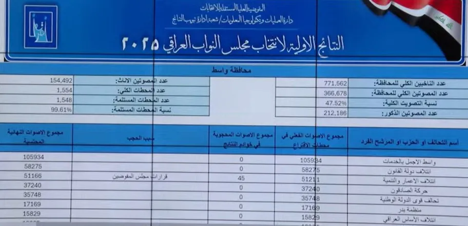 أعلنت المفوضية العليا المستقلة للانتخابات في العراق، مساء اليوم الأربعاء، تصدر "واسط الأجمل بالخدمات" على عدد الأصوات في محافظة واسط (105 آلاف صوت)، فيما جاء في المرتبة الثانية ائتلاف دولة القانون (58 ألف صوت)، وائتلاف الإعمار والتنمية ثالثاً (51 ألف صوت).