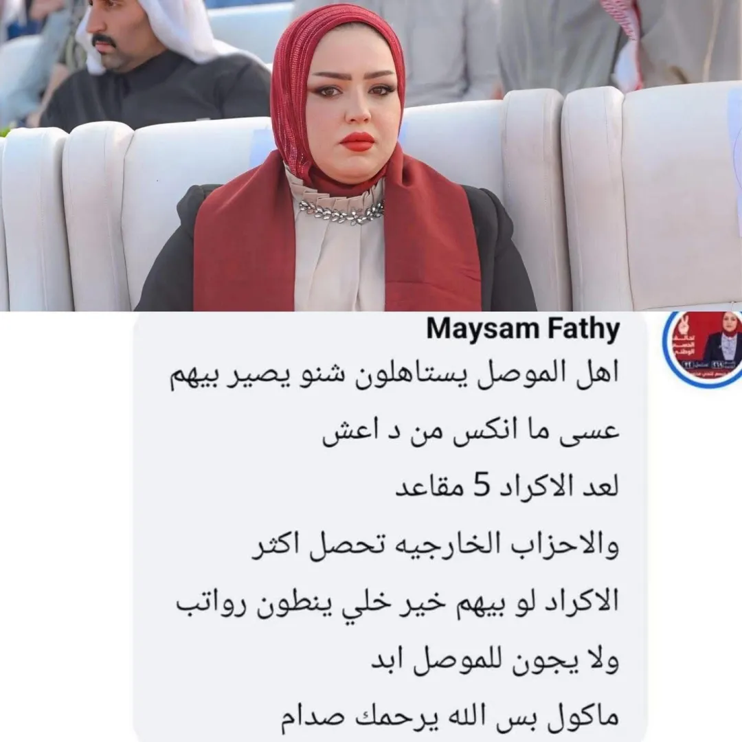 وكانت المرشحة عن محافظة نينوى، ميسم فتحي، قد نشرت تعليقًا عبر في فيسبوك عقب خسارتها في الانتخابات قالت فيه: "أهل الموصل يستاهلون شنو يصير بيهم"، وختمته بــ"الترحم على صدام".
