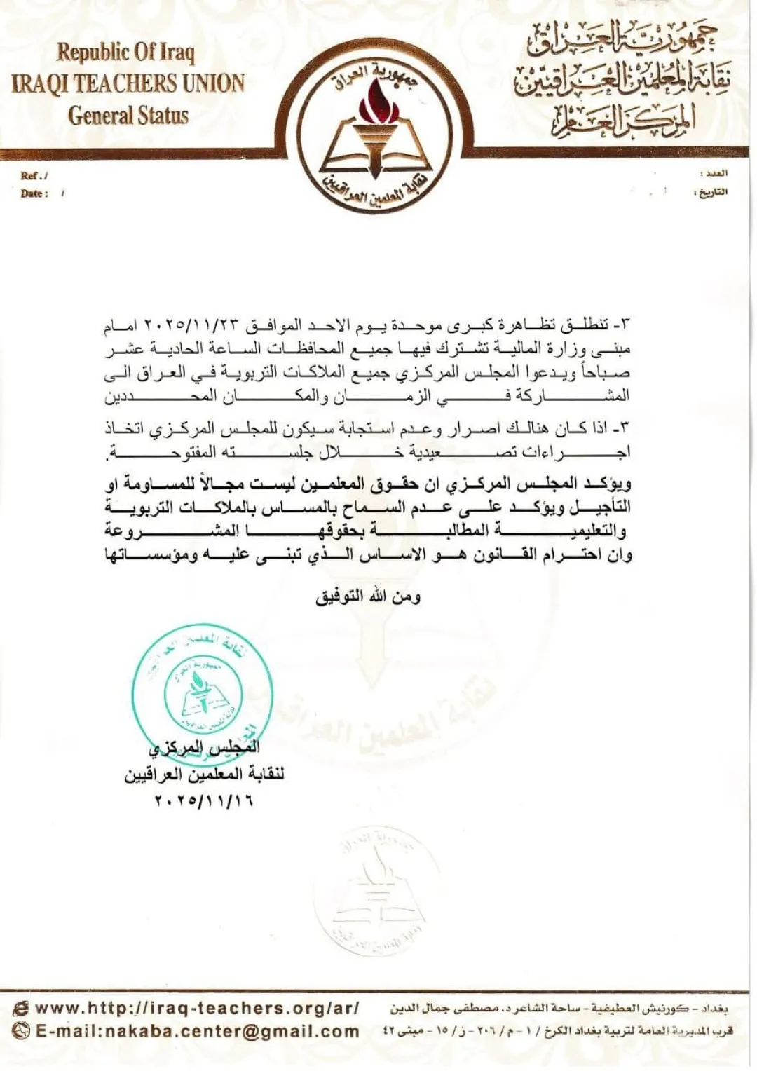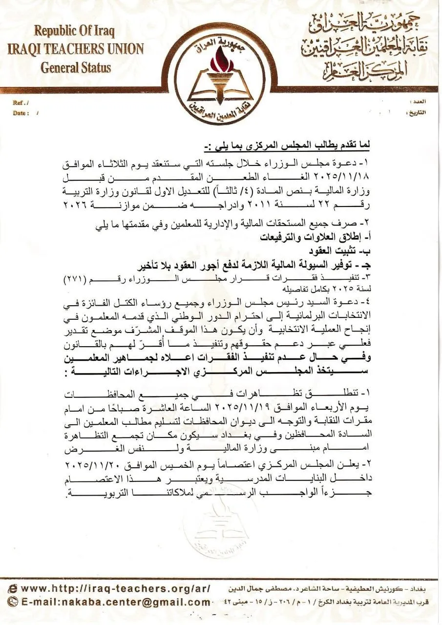 وبناءً على ذلك، دعت النقابة "مجلس الوزراء خلال جلسته التي ستنعقد يوم الثلاثاء المقبل إلى إلغاء الطعن المقدم من قبل وزارة المالية بنص المادة (4/ ثالثاً) للتعديل الأول لقانون وزارة التربية رقم 22 لسنة 2011 وإدراجه ضمن موازنة 2026، وصرف جميع المستحقات المالية والإدارية للمعلمين وفي مقدمتها ما يلي أ- إطلاق العلاوات والترفيعات، ب- تثبيت العقود، ج - توفير السيولة المالية اللازمة لدفع أجور العقود بلا تأخير، وتنفيذ فقرات قرار مجلس الوزراء رقم (271) لسنة 2025 بكامل تفاصيله".