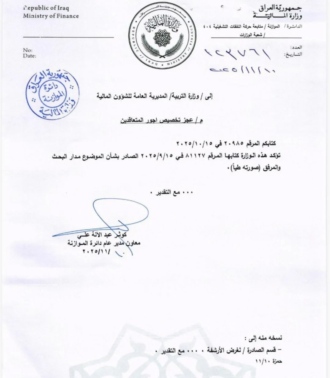 أما الكتاب الآخر، الصادر عن وزارة المالية في (10 تشرين الثاني/ نوفمبر الجاري) والموجه إلى وزارة التربية العراقية، حمل عنوان: "عجز تخصيص أجور المتعاقدين".