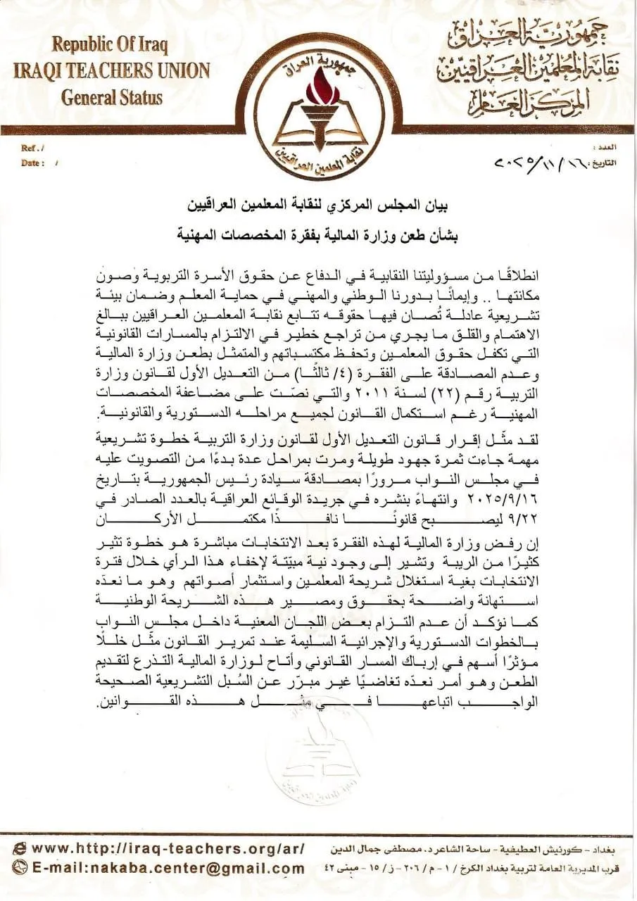 أعلنت نقابة المعلمين العراقيين، يوم الأحد، رفضها لطعن وزارة المالية وعدم المصادقة على الفقرة (4/ ثالثاً) من التعديل الأول لقانون وزارة التربية رقم (22) لسنة 2011 والتي نصت على مضاعفة المخصصات المهنية رغم استكمال القانون لجميع مراحله الدستورية والقانونية.