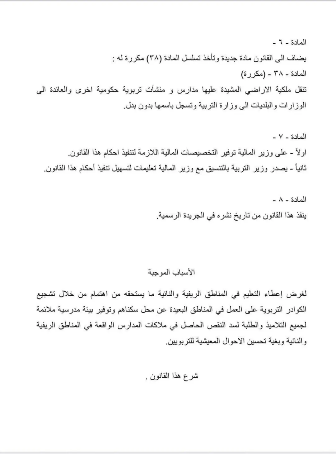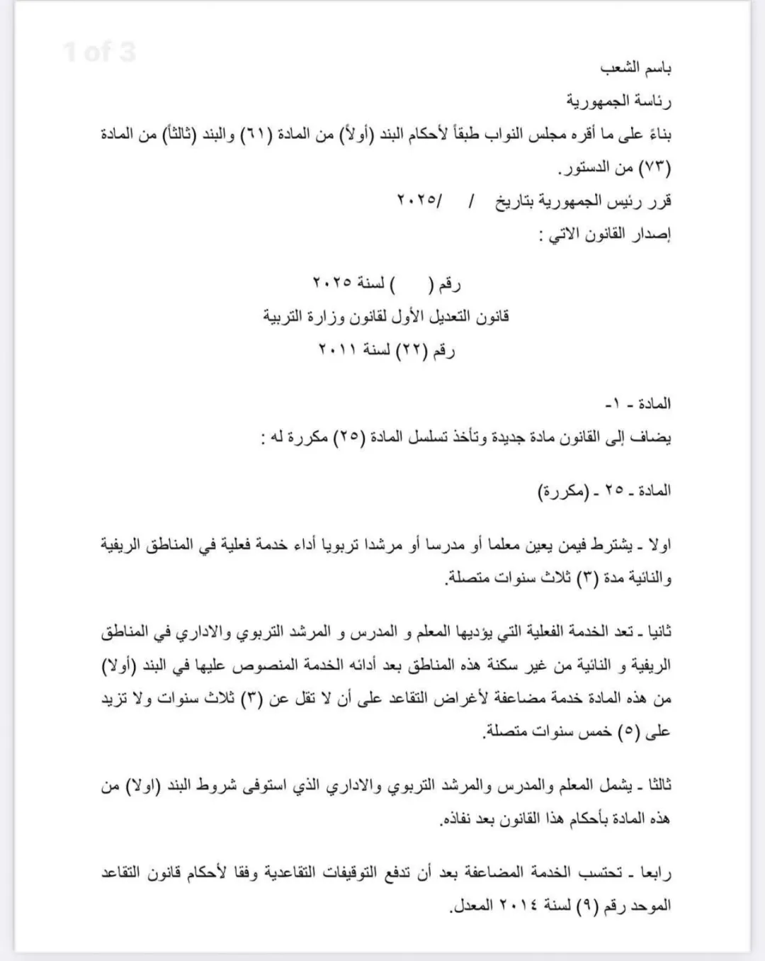 وكان مجلس النواب قد صوت في 25 آب/أغسطس 2025، على النسخة النهائية لقانون التعديل الأول لقانون وزارة التربية رقم (22) لسنة 2011، بهدف "إعطاء التعليم في المناطق الريفية والنائية ما يستحقه من اهتمام من خلال تشجيع الكوادر التربوية على العمل في المناطق البعيدة عن محل سكناهم"، بحسب بيان للدائرة الإعلامية للمجلس.