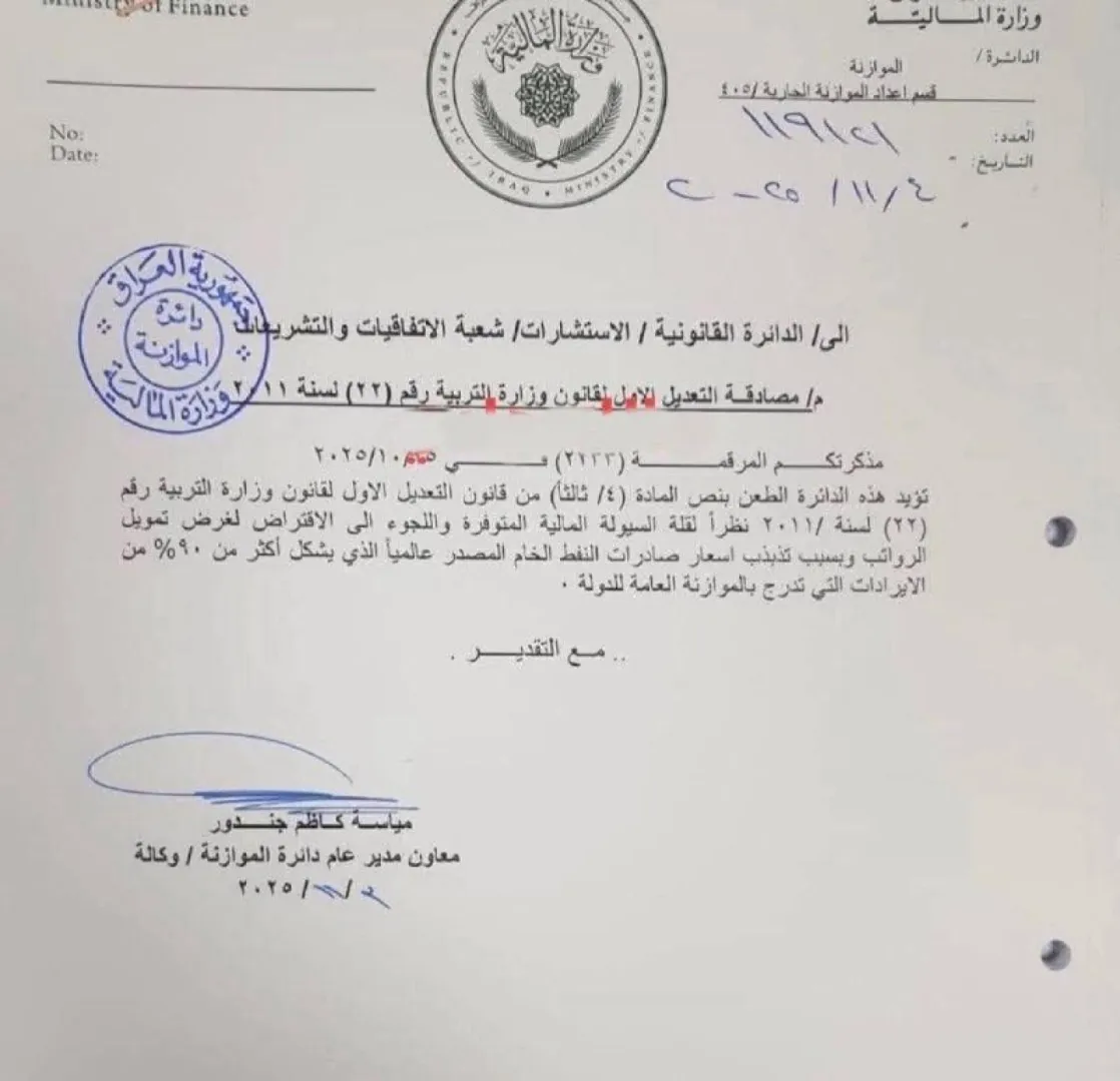 لكن انتشر مؤخراً كتابان صادران عن وزارة المالية الاتحادية، أحدهما "يطعن بالمصادقة على قانون التعديل الأول لقانون وزارة التربية رقم (22) لسنة 2011". والآخر يتعلق بـ"عجز تخصيص أجور المتعاقدين".