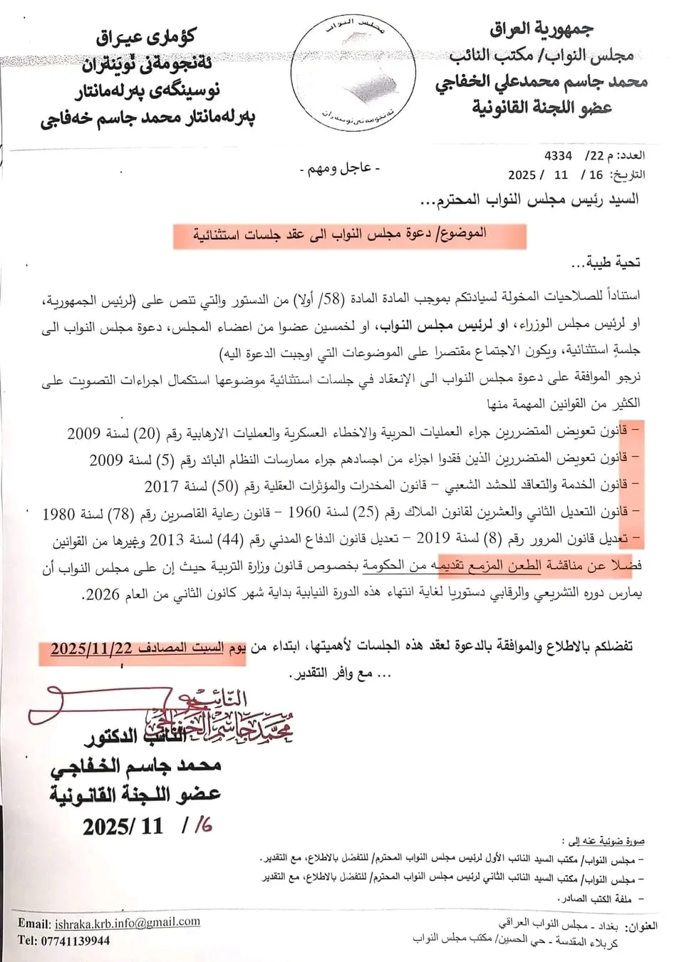 وقال الخفاجي، بحسب وثيقة وردت لوكالة شفق نيوز، إنه "استناداً للصلاحيات المخولة لسيادتكم بموجب المادة (58/أولاً) من الدستور والتي تنص على (لرئيس الجمهورية، أو لرئيس مجلس الوزراء، أو لرئيس مجلس النواب، أو لخمسين عضواً من أعضاء المجلس، دعوة مجلس النواب إلى جلسة استثنائية، ويكون الاجتماع مقتصراً على الموضوعات التي أوجبت الدعوة إليه)".