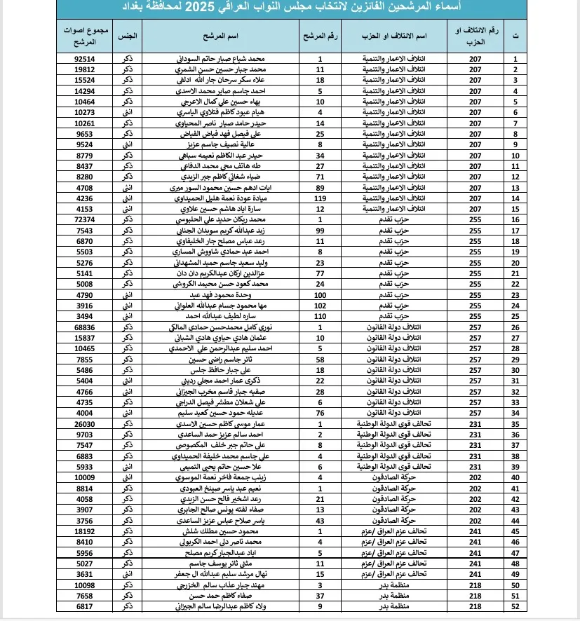 ورابعاً تحالف قوى الدولة الوطنية بحصوله على 138 ألف صوت ليكون له 5 مقاعد، وخامساً حركة الصادقون بحصولها على 128 ألف صوت ليكون لها 5 مقاعد، وسادساً تحالف عزم العراق/ عزم بحصوله على 128 ألف صوت ليكون له 5 مقاعد.