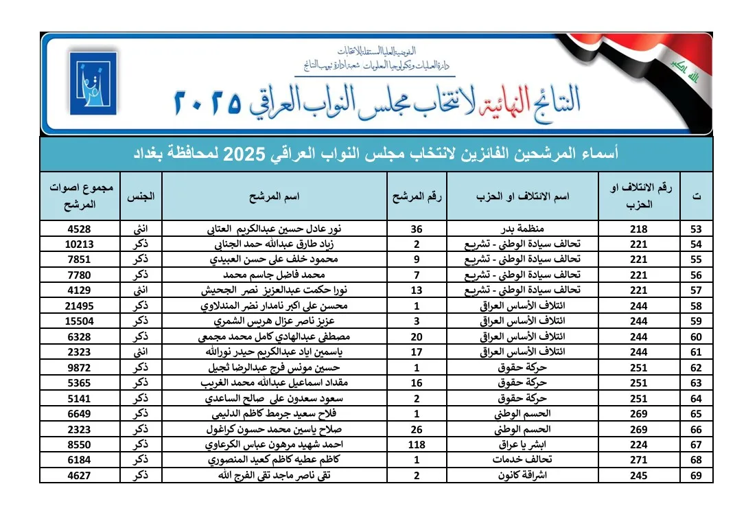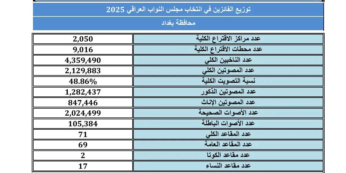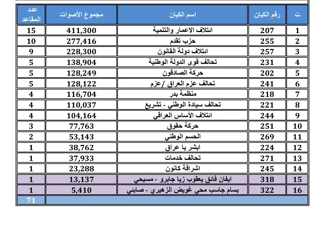 وبهذا يكون مجموع عدد المقاعد لمحافظة بغداد 71 مقعداً.