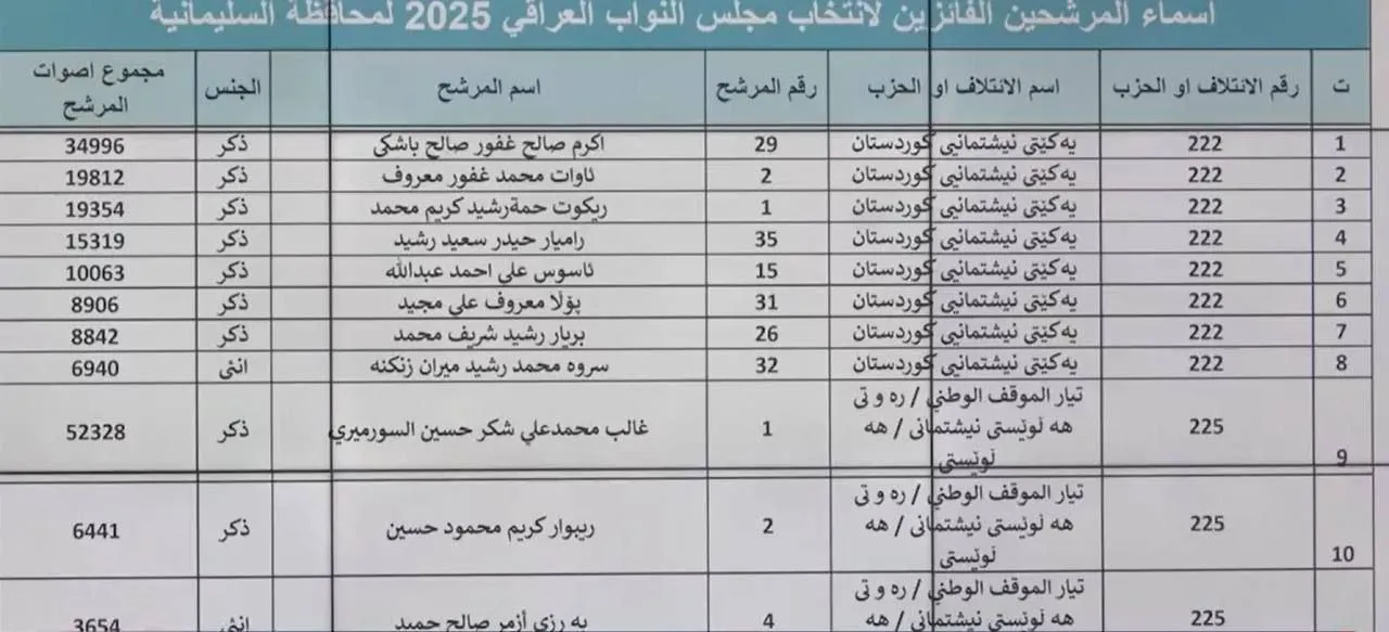 وجاء في المؤتمر كذلك تصدر عن محافظة السليمانية غالب محمد علي عن تيار الموقف الوطني بحصوله على 52 ألف صوت، فيما تصدر الاتحاد الوطني الكوردستاني المحافظة يليه تيار الموقف الوطني وثالثاً الجيل الجديد.