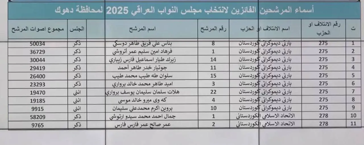 وفي دهوك تصدر جمال أحمد عن الاتحاد الإسلامي الكوردستاني بحصوله على 58 ألف صوت، فيما تصدر الحزب الديمقراطي الكوردستاني المحافظة ليله الاتحاد الإسلامي الكوردستاني ثانياً.