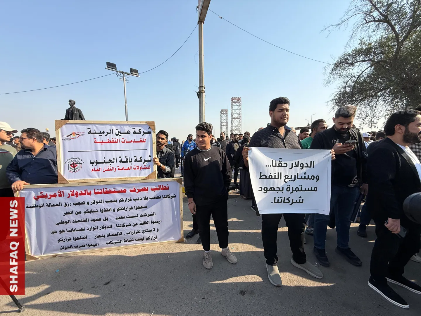 تظاهر عدد من ممثلي الشركات ورجال الأعمال والمقاولين العاملين ضمن جولات التراخيص النفطية في محافظة البصرة، يوم الخميس، أمام فرع البنك المركزي احتجاجاً على التعليمات التي قالوا إنها عطلت صرف مستحقاتهم بالدولار وتسببت بشلل في حركة العمل.