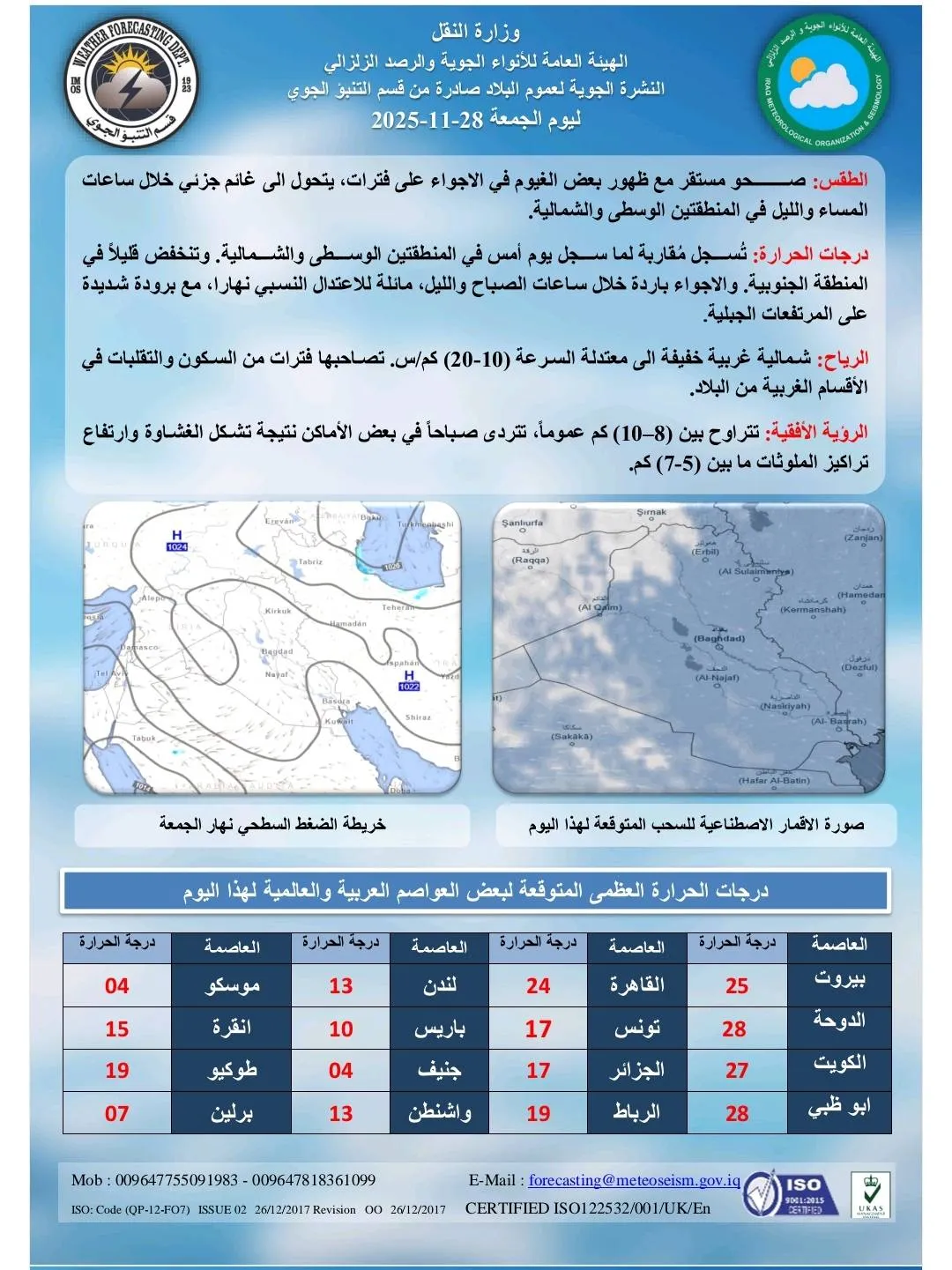 وذكرت الهيئة في النشرة الجوية لهذا التي وردت لوكالة شفق نيوز، أن أدنى درجة حرارة ستكون 16 درجة مئوية في محافظة دهوك ومن بعدها السليمانية 17 درجة، بينما تسجل محافظة البصرة أعلى درجة وهي 27 درجة مئوية، ومن بعدها ميسان وذي قار 26 درجة.