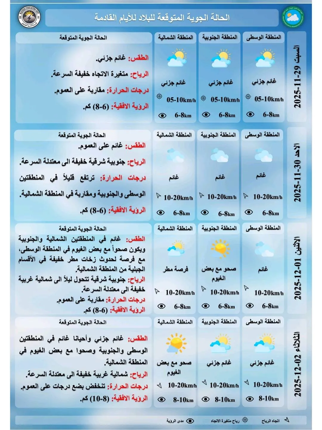 في حين سيكون الطقس صحواً بشكل عام مع ظهور بعض الغيوم في الأجواء على فترات، ويتحول إلى غائم جزئي خلال ساعات المساء والليل في المنطقتين الوسطى والشمالية.