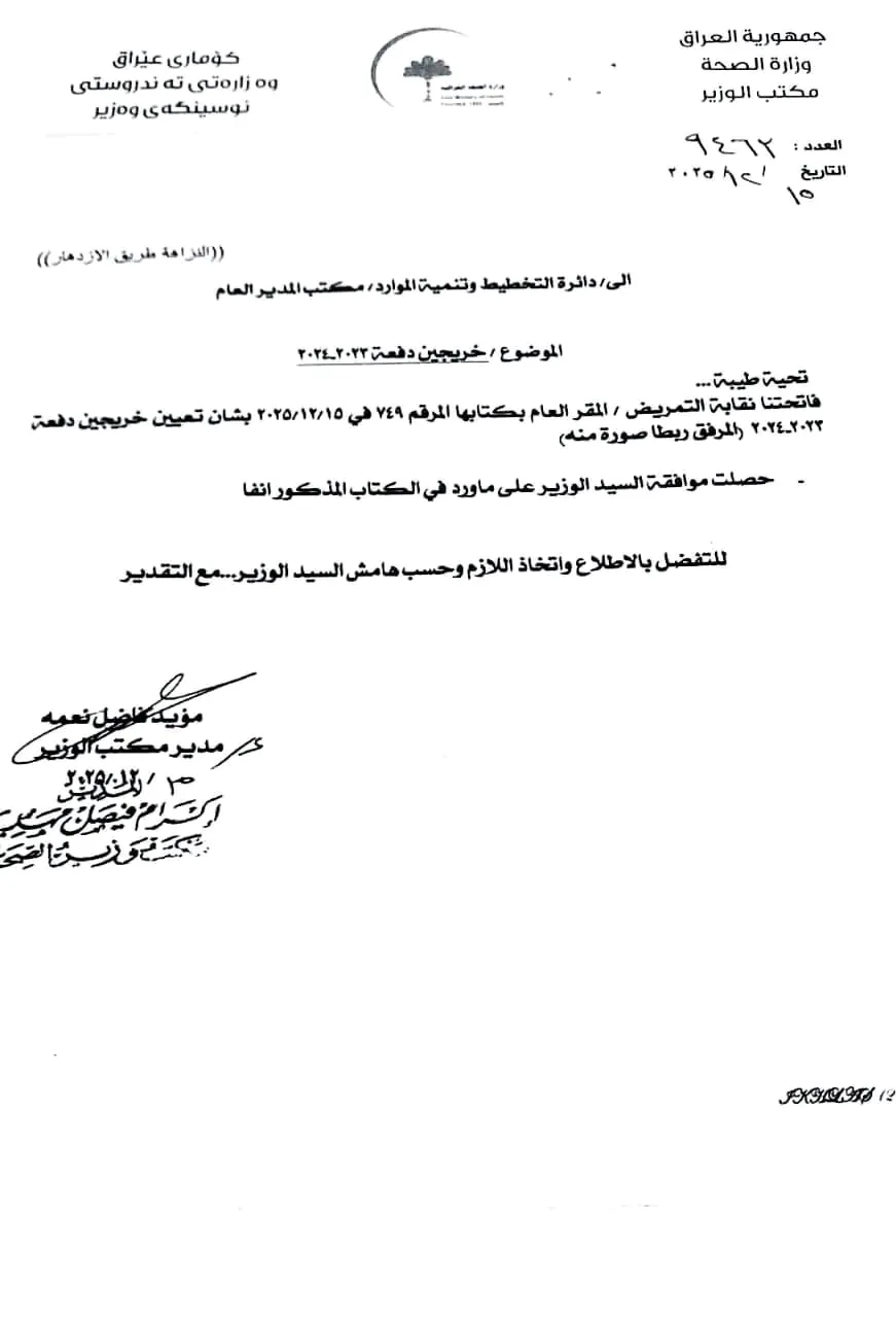 وقالت، إن "الكتاب الرسمي صدر اليوم من مكتب وزير الصحة (العدد: 9462 بتاريخ 15/12/2025) والموجّه إلى دائرة التخطيط وتنمية الموارد، والذي يتضمن حصول موافقة الوزير على ما ورد في كتابنا (المرقم 749) بشأن تعيين خريجي دفعة (2023-2024) ".