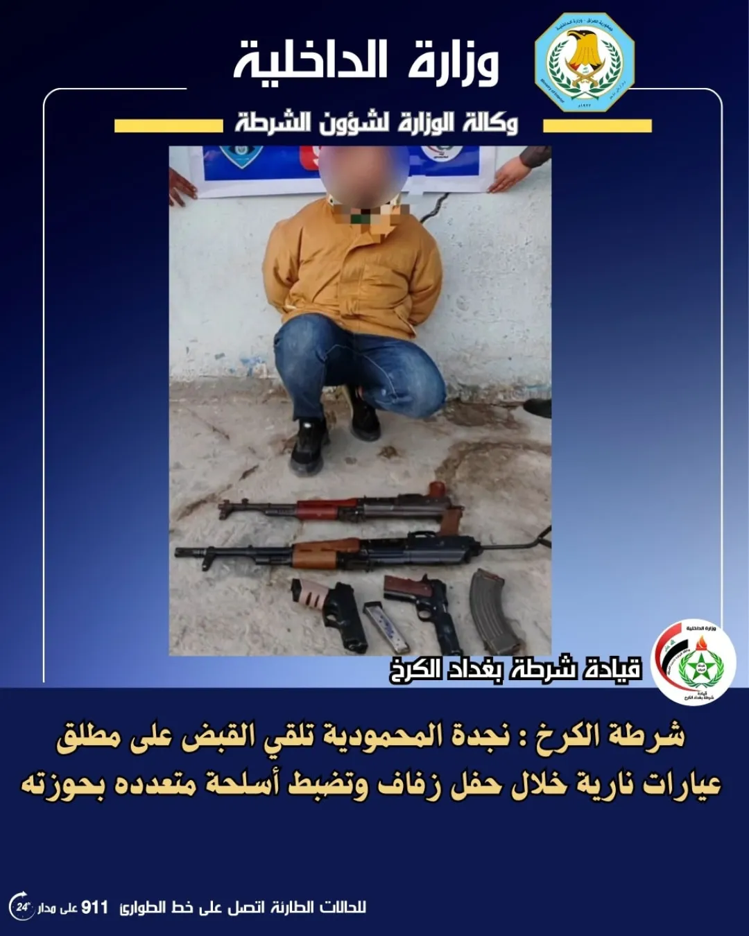 ومن بابل إلى العاصمة بغداد، حيث أعلنت قيادة شرطة الكرخ في بيان ورد لوكالة شفق نيوز "رصد إطلاق عيارات نارية خلال حفل زفاف وأثناء ملاحظة الدورية لمرتكب الفعل، لاذ بالفرار، وتمت ملاحقته والقبض عليه بعد مطاردة، وأسفر تفتيش العجلة التي كان يستقلها عن ضبط 4 قطع سلاح شملت بندقيتي كلاشنكوف ومسدسين مع عتادها".