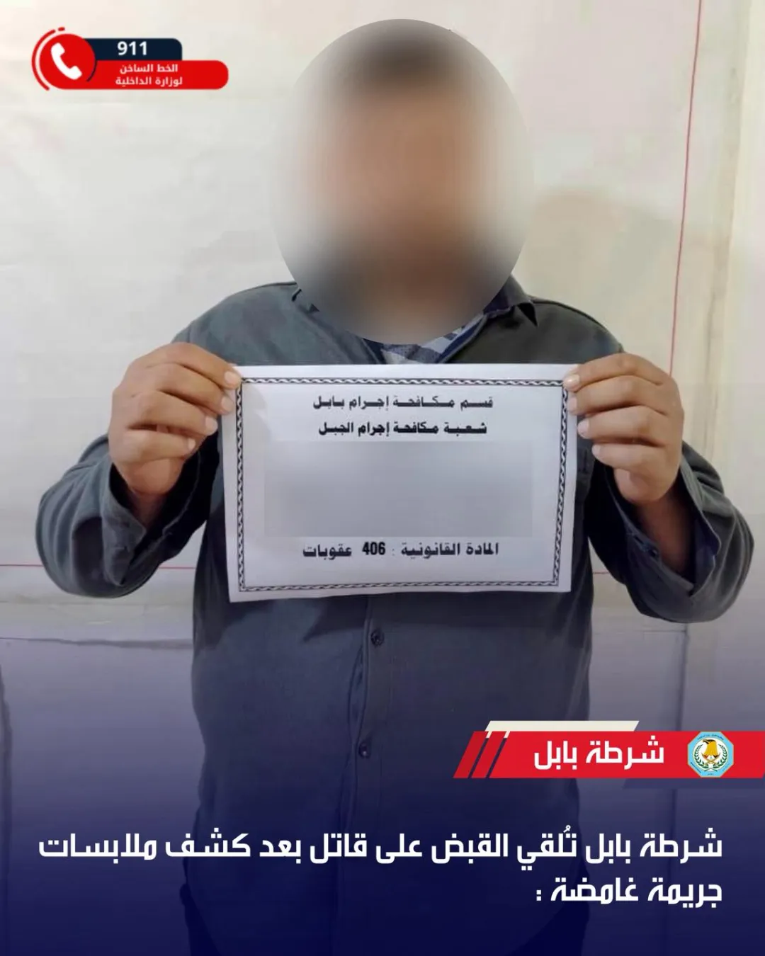 وفي سياق جرائم القتل أيضاً أعلنت قيادة شرطة محافظة بابل في بيان ورد للوكالة، "التوصل إلى متهم بالقتل بعد كشف ملابسات العثور على جثة في منطقة النيل/ طريق البو نافع، والذي اعترف بارتكاب الجريمة بعد مواجهته بالأدلة".