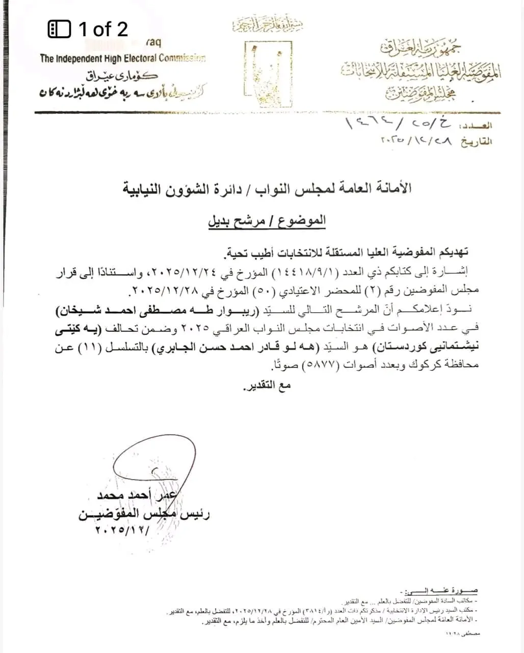 وبحسب كتاب رسمي موجه من مفوضية الانتخابات إلى رئاسة مجلس النواب، اطلعت عليه وكالة شفق نيوز، فقد أوضحت المفوضية أن المرشح التالي لشغل المقعد النيابي عن الاتحاد الوطني الكوردستاني، كبديل لريبوار طه، هو المرشح "هلو قادر أحمد حسن الجابري".