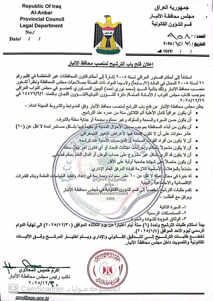 يعلن مجلس محافظة الأنبار عن فتح باب الترشح لمنصب