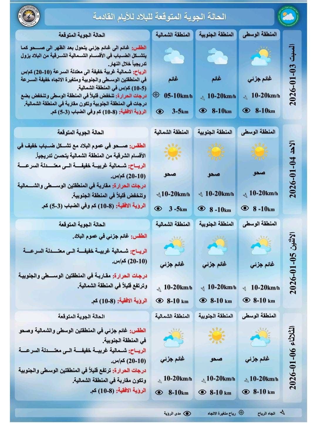 المنطقة الشمالية "، مبينة ان "طقس الاحد سيكون صحوا في عموم البلاد مع تشكيل ضباب خفيف في الأقسام الشرقية من المنطقة الشمالية ودرجات الحرارة مقاربة في المنطقتين الوسطى والشمالية وتنخفض قليلا في المنطقة الجنوبية".