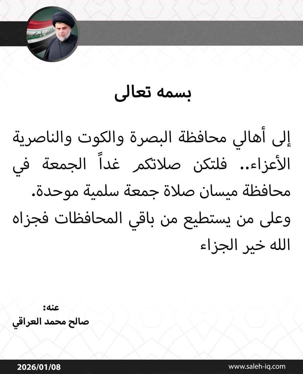 ونشر وزير القائد، صالح محمد العراقي ، تدوينة، نقلاً عن السيد الصدر ، أنه "إلى أهالي محافظة البصرة وذي قار وواسط، فلتكن صلاتكم غداً الجمعة في محافظة ميسان صلاة جماعية سلمية موحدة".