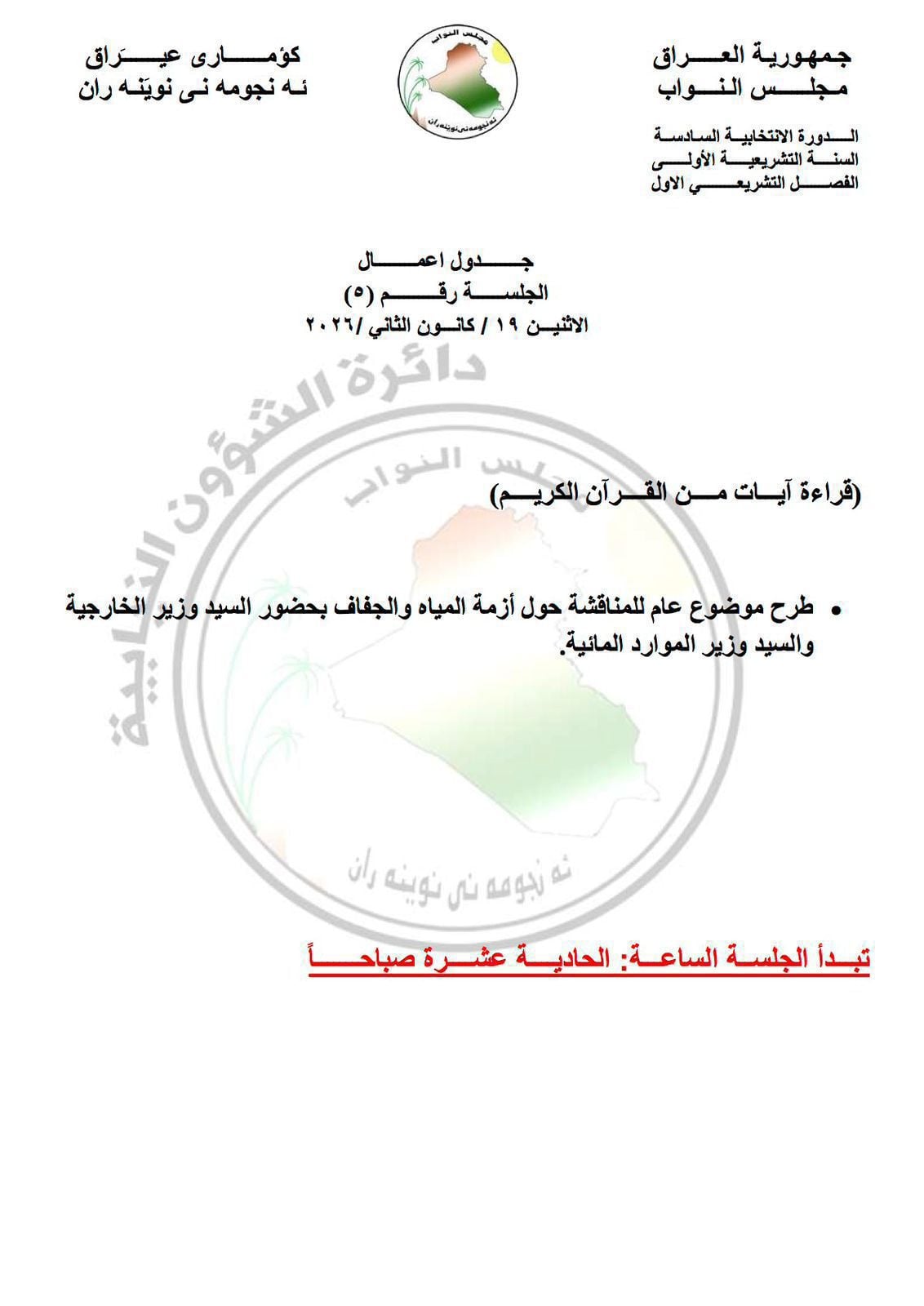 وبحسب جدول أعمال مجلس النواب ، فإن الجلسة الخامسة ستعقد يوم الاثنين 19 كانون الثاني 2026، عند الساعة الـ11 صباحاً؛ لمناقشة موضوع أزمة المياه والجفاف، بحضور وزير الخارجية ووزير الموارد المائية.