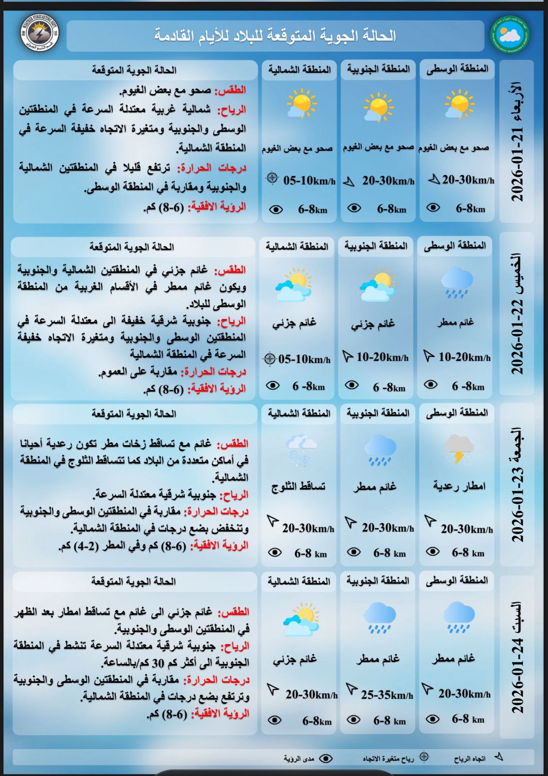 وذكر ان "طقس يوم السبت القادم سيكون غائماً جزئياً إلى غائم مع تساقط امطار بعد الظهر في المنطقتين الوسطى والجنوبية، ودرجات الحرارة مقاربة في المنطقتين الوسطى والجنوبية وترتفع بضع درجات في المنطقة الشمالية".
