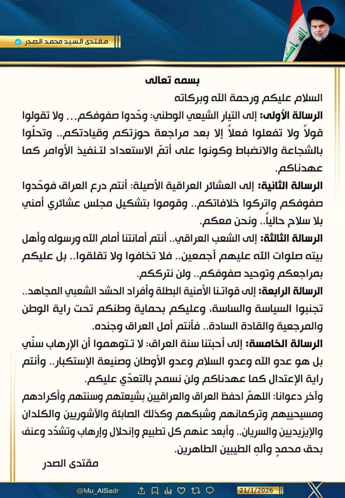 كما تضمنت الرسالة الثالثة الى الشعب العراقي، والرابعة الى القوات الامنية وأفراد