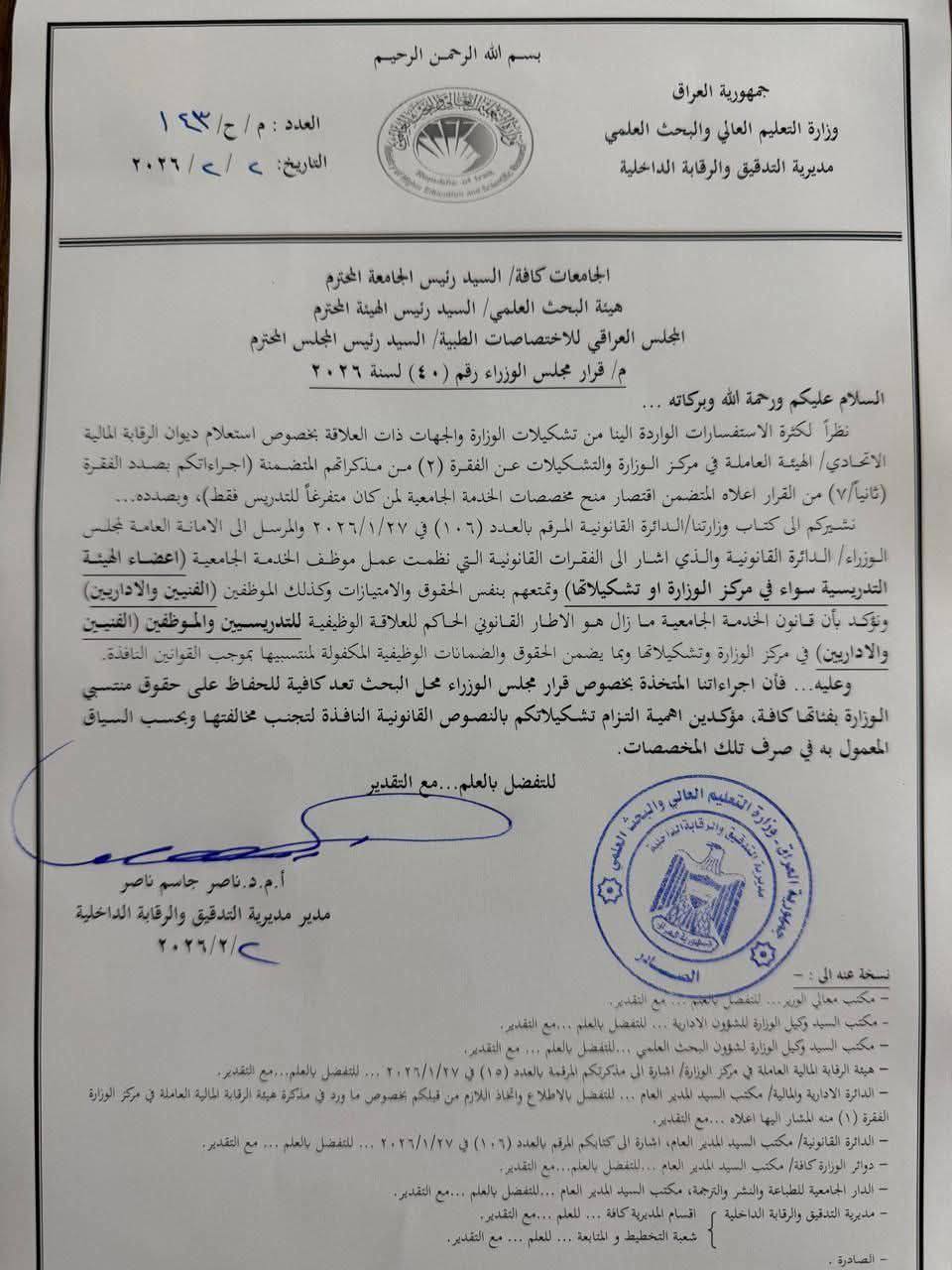 وجاء في كتاب للوزارة وموجه الى الجامعات كافة انه "نظراً لكثرة الاستفسارات الواردة الينا من تشكيلات الوزارة والجهات ذات العلاقة بخصوص استعلام