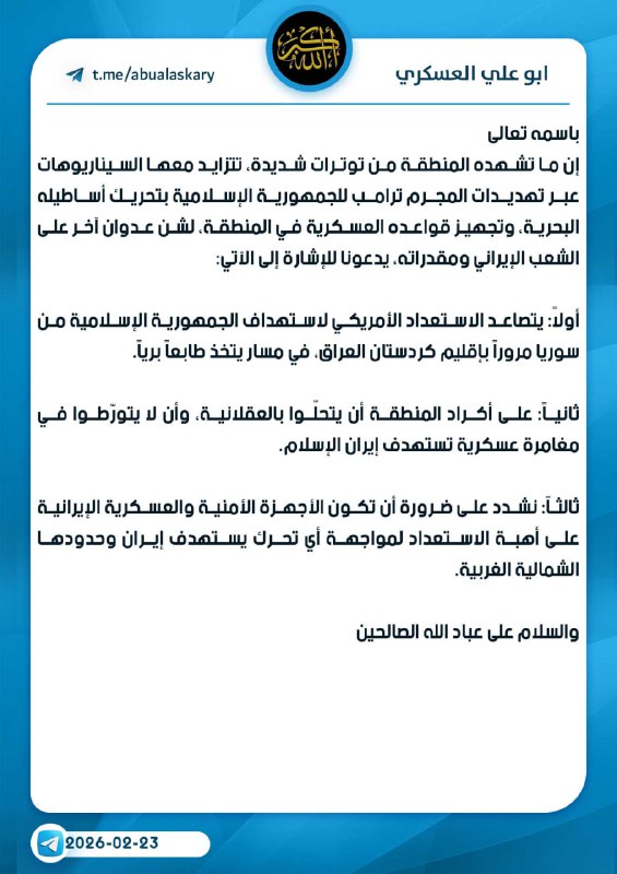 وجاء في بيان للعسكري، "يتصاعد الاستعداد الأمريكي لاستهداف الجمهورية الإسلامية من سوريا مروراً بإقليم كردستان العراق ، في مسار يتخذ طابعاً برياً".
